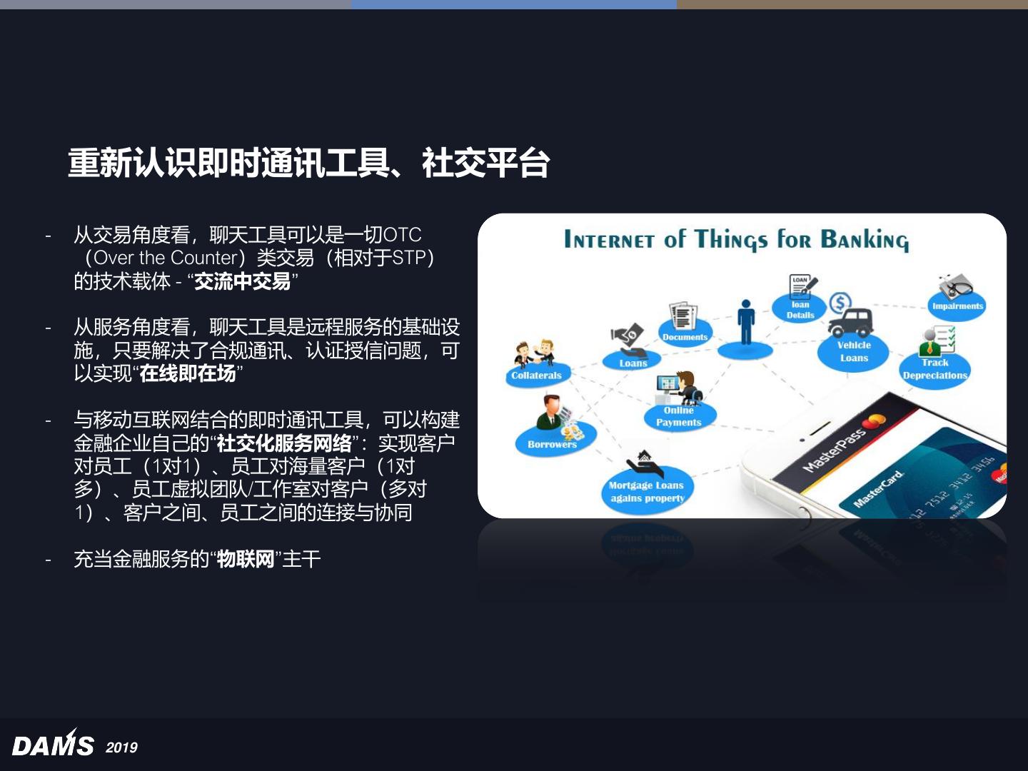 22 . 重新认识即时通讯工具、社交平台 - 从交易角度看,聊天工具可以是一切OTC (Over the Counter)类交易(相对于STP) 的技术载体 - “交流中交易” - 从服务角度看,聊天工具是远程服务的基础设 施,只要解决了合规通讯、认证授信问题,可 以实现“在线即在场” - 与移动互联网结合的即时通讯工具,可以构建 金融企业自己的“社交化服务网络”:实现客户 对员工(1对1)、员工对海量客户(1对 多)、员工虚拟团队/工作室对客户(多对 1)、客户之间、员工之间的连接与协同 - 充当金融服务的“物联网”主干 2019