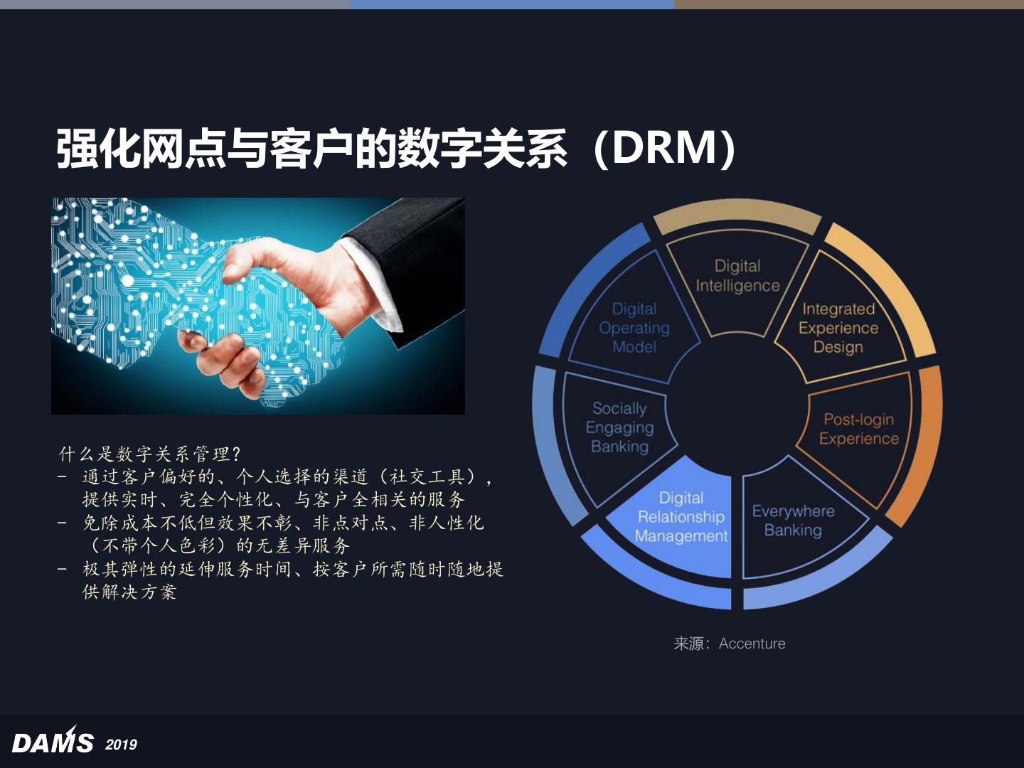 25 .强化网点与客户的数字关系(DRM) 什么是数字关系管理? - 通过客户偏好的、个人选择的渠道(社交工具), 提供实时、完全个性化、与客户全相关的服务 - 免除成本不低但效果不彰、非点对点、非人性化 (不带个人色彩)的无差异服务 - 极其弹性的延伸服务时间、按客户所需随时随地提 供解决方案 来源:Accenture 2019