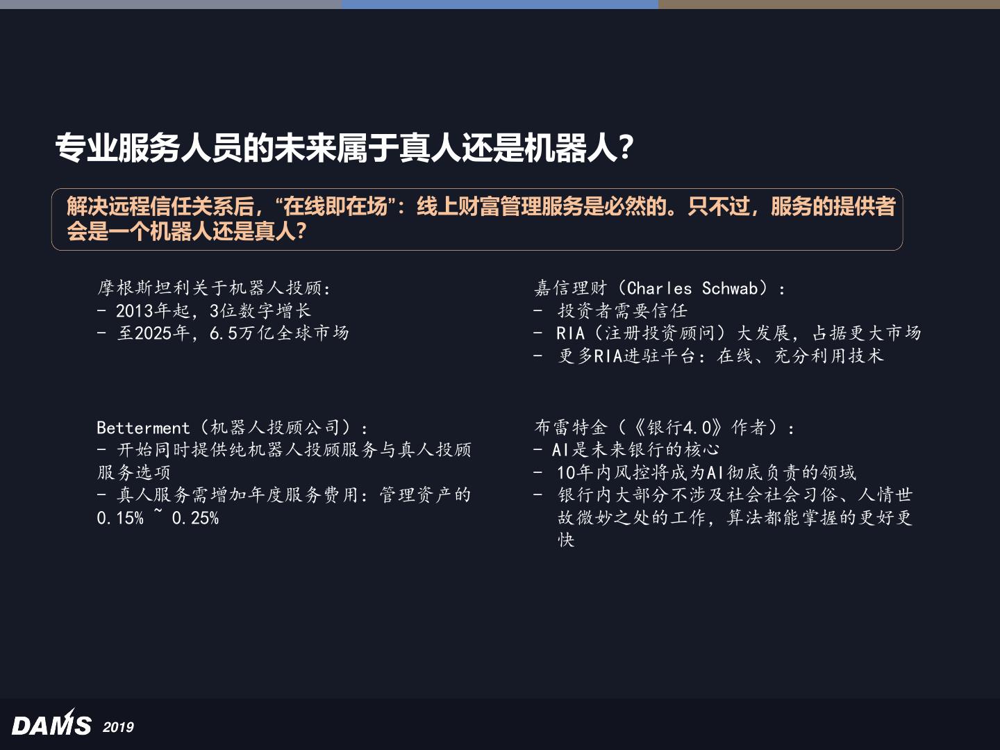 27 .专业服务人员的未来属于真人还是机器人? 解决远程信任关系后,“在线即在场”:线上财富管理服务是必然的。只不过,服务的提供者 会是一个机器人还是真人? 摩根斯坦利关于机器人投顾: 嘉信理财(Charles Schwab): - 2013年起,3位数字增长 - 投资者需要信任 - 至2025年,6.5万亿全球市场 - RIA(注册投资顾问)大发展,占据更大市场 - 更多RIA进驻平台:在线、充分利用技术 Betterment(机器人投顾公司): 布雷特金(《银行4.0》作者): - 开始同时提供纯机器人投顾服务与真人投顾 - AI是未来银行的核心 服务选项 - 10年内风控将成为AI彻底负责的领域 - 真人服务需增加年度服务费用:管理资产的 - 银行内大部分不涉及社会社会习俗、人情世 0.15% ~ 0.25% 故微妙之处的工作,算法都能掌握的更好更 快 2019