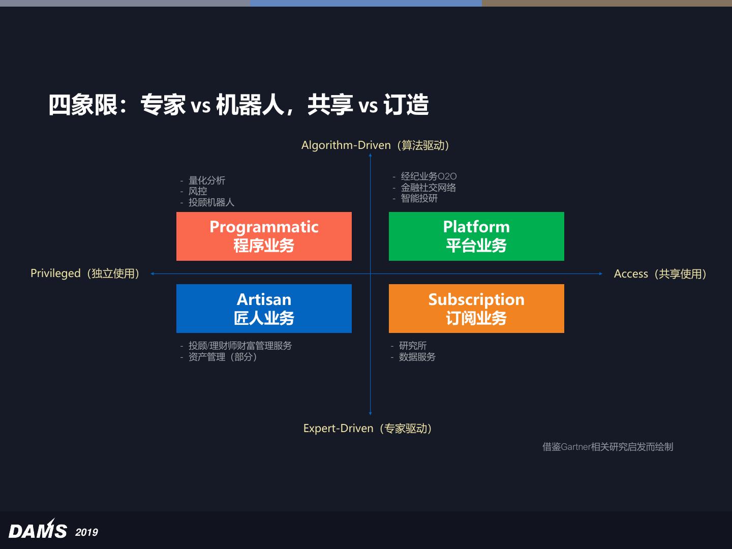 29 .智能投顾 – 算法与人的结合 Cyborg:算法/机器人获得专家赋予 的“人性化”(投资决策需要被理性解 释,纯粹的深度学习带来的投资决定 无法解释、复盘对于投资者更加像“买 大小”;市场异动导致的对不确定性恐 惧、损失后的心理问题,需要人类投 顾的辅导、安抚) AR:算法与机器人助手,是对人类投 顾的“增强现实” 2019