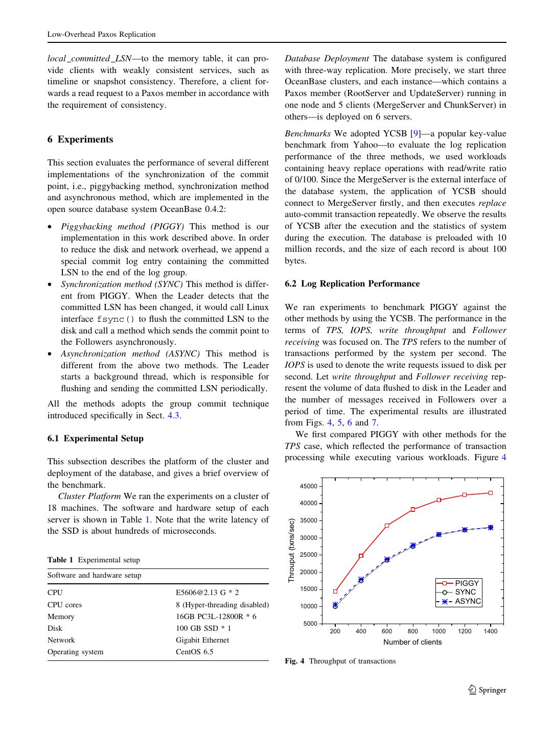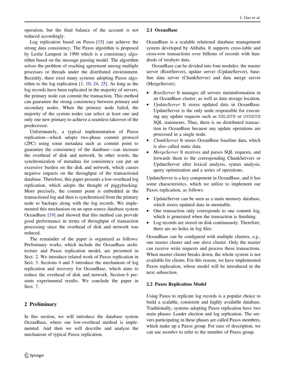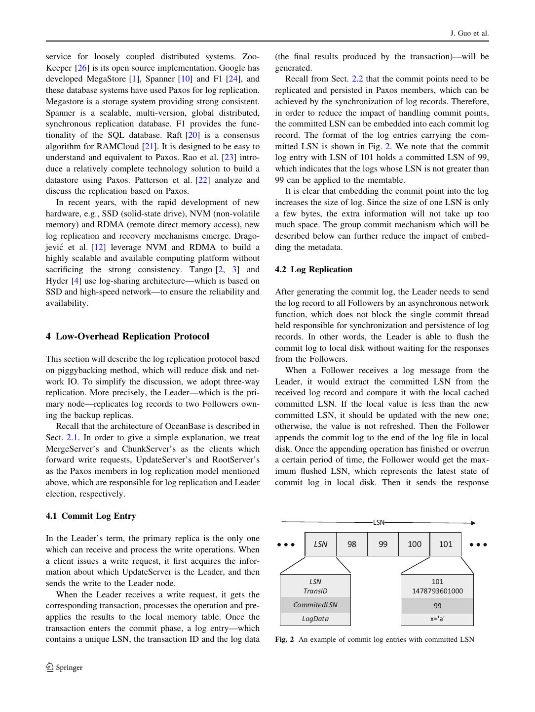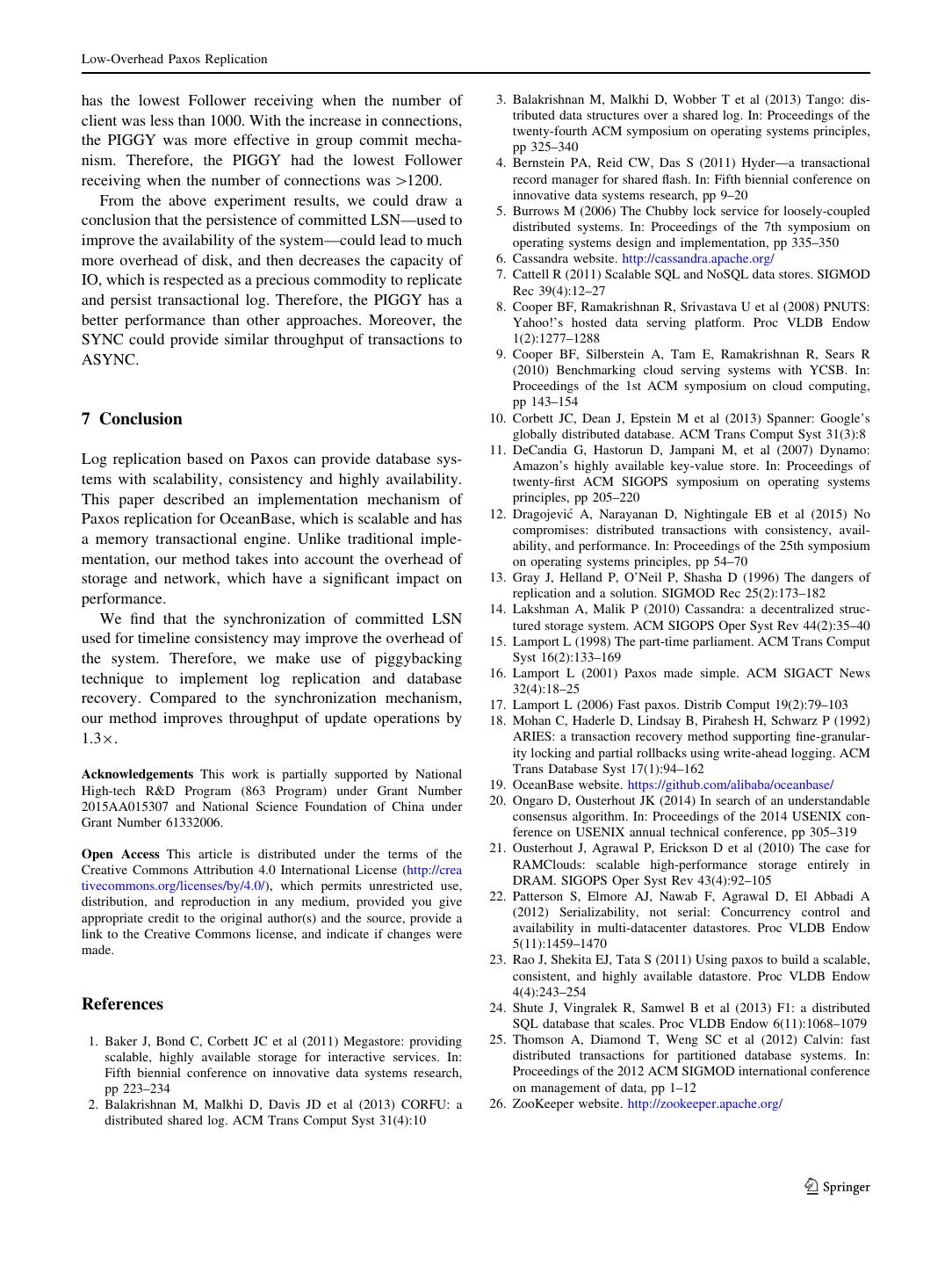 9 .Low-Overhead Paxos Replication has the lowest Follower receiving when the number of 3. Balakrishnan M, Malkhi D, Wobber T et al (2013) Tango: dis- client was less than 1000. With the increase in connections, tributed data structures over a shared log. In: Proceedings of the twenty-fourth ACM symposium on operating systems principles, the PIGGY was more effective in group commit mecha- pp 325–340 nism. Therefore, the PIGGY had the lowest Follower 4. Bernstein PA, Reid CW, Das S (2011) Hyder—a transactional receiving when the number of connections was [1200. record manager for shared flash. In: Fifth biennial conference on From the above experiment results, we could draw a innovative data systems research, pp 9–20 5. Burrows M (2006) The Chubby lock service for loosely-coupled conclusion that the persistence of committed LSN—used to distributed systems. In: Proceedings of the 7th symposium on improve the availability of the system—could lead to much operating systems design and implementation, pp 335–350 more overhead of disk, and then decreases the capacity of 6. Cassandra website. http://cassandra.apache.org/ IO, which is respected as a precious commodity to replicate 7. Cattell R (2011) Scalable SQL and NoSQL data stores. SIGMOD Rec 39(4):12–27 and persist transactional log. Therefore, the PIGGY has a 8. Cooper BF, Ramakrishnan R, Srivastava U et al (2008) PNUTS: better performance than other approaches. Moreover, the Yahoo!’s hosted data serving platform. Proc VLDB Endow SYNC could provide similar throughput of transactions to 1(2):1277–1288 ASYNC. 9. Cooper BF, Silberstein A, Tam E, Ramakrishnan R, Sears R (2010) Benchmarking cloud serving systems with YCSB. In: Proceedings of the 1st ACM symposium on cloud computing, pp 143–154 7 Conclusion 10. Corbett JC, Dean J, Epstein M et al (2013) Spanner: Google’s globally distributed database. ACM Trans Comput Syst 31(3):8 11. DeCandia G, Hastorun D, Jampani M, et al (2007) Dynamo: Log replication based on Paxos can provide database sys- Amazon’s highly available key-value store. In: Proceedings of tems with scalability, consistency and highly availability. twenty-first ACM SIGOPS symposium on operating systems This paper described an implementation mechanism of principles, pp 205–220 Paxos replication for OceanBase, which is scalable and has 12. Dragojević A, Narayanan D, Nightingale EB et al (2015) No compromises: distributed transactions with consistency, avail- a memory transactional engine. Unlike traditional imple- ability, and performance. In: Proceedings of the 25th symposium mentation, our method takes into account the overhead of on operating systems principles, pp 54–70 storage and network, which have a significant impact on 13. Gray J, Helland P, O’Neil P, Shasha D (1996) The dangers of performance. replication and a solution. SIGMOD Rec 25(2):173–182 14. Lakshman A, Malik P (2010) Cassandra: a decentralized struc- We find that the synchronization of committed LSN tured storage system. ACM SIGOPS Oper Syst Rev 44(2):35–40 used for timeline consistency may improve the overhead of 15. Lamport L (1998) The part-time parliament. ACM Trans Comput the system. Therefore, we make use of piggybacking Syst 16(2):133–169 technique to implement log replication and database 16. Lamport L (2001) Paxos made simple. ACM SIGACT News 32(4):18–25 recovery. Compared to the synchronization mechanism, 17. Lamport L (2006) Fast paxos. Distrib Comput 19(2):79–103 our method improves throughput of update operations by 18. Mohan C, Haderle D, Lindsay B, Pirahesh H, Schwarz P (1992) 1.39. ARIES: a transaction recovery method supporting fine-granular- ity locking and partial rollbacks using write-ahead logging. ACM Acknowledgements This work is partially supported by National Trans Database Syst 17(1):94–162 High-tech R&D Program (863 Program) under Grant Number 19. OceanBase website. https://github.com/alibaba/oceanbase/ 2015AA015307 and National Science Foundation of China under 20. Ongaro D, Ousterhout JK (2014) In search of an understandable Grant Number 61332006. consensus algorithm. In: Proceedings of the 2014 USENIX con- ference on USENIX annual technical conference, pp 305–319 Open Access This article is distributed under the terms of the 21. Ousterhout J, Agrawal P, Erickson D et al (2010) The case for Creative Commons Attribution 4.0 International License (http://crea RAMClouds: scalable high-performance storage entirely in tivecommons.org/licenses/by/4.0/), which permits unrestricted use, DRAM. SIGOPS Oper Syst Rev 43(4):92–105 distribution, and reproduction in any medium, provided you give 22. Patterson S, Elmore AJ, Nawab F, Agrawal D, El Abbadi A appropriate credit to the original author(s) and the source, provide a (2012) Serializability, not serial: Concurrency control and link to the Creative Commons license, and indicate if changes were availability in multi-datacenter datastores. Proc VLDB Endow made. 5(11):1459–1470 23. Rao J, Shekita EJ, Tata S (2011) Using paxos to build a scalable, consistent, and highly available datastore. Proc VLDB Endow 4(4):243–254 References 24. Shute J, Vingralek R, Samwel B et al (2013) F1: a distributed SQL database that scales. Proc VLDB Endow 6(11):1068–1079 1. Baker J, Bond C, Corbett JC et al (2011) Megastore: providing 25. Thomson A, Diamond T, Weng SC et al (2012) Calvin: fast scalable, highly available storage for interactive services. In: distributed transactions for partitioned database systems. In: Fifth biennial conference on innovative data systems research, Proceedings of the 2012 ACM SIGMOD international conference pp 223–234 on management of data, pp 1–12 2. Balakrishnan M, Malkhi D, Davis JD et al (2013) CORFU: a 26. ZooKeeper website. http://zookeeper.apache.org/ distributed shared log. ACM Trans Comput Syst 31(4):10 123