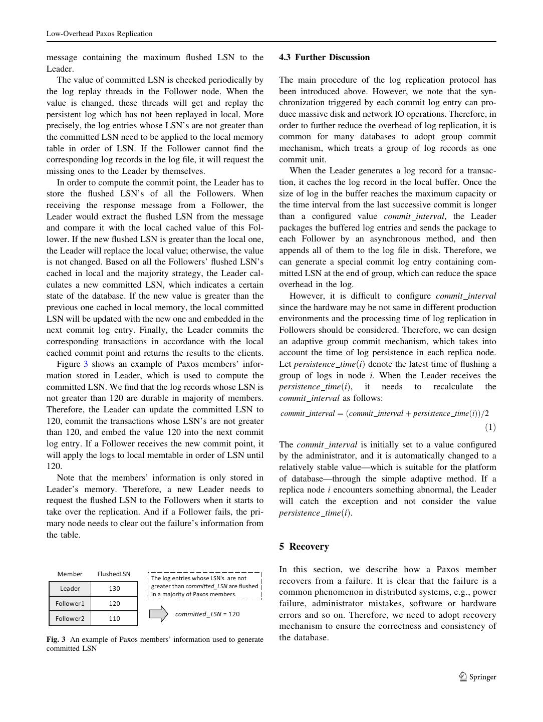 5 .Low-Overhead Paxos Replication message containing the maximum flushed LSN to the 4.3 Further Discussion Leader. The value of committed LSN is checked periodically by The main procedure of the log replication protocol has the log replay threads in the Follower node. When the been introduced above. However, we note that the syn- value is changed, these threads will get and replay the chronization triggered by each commit log entry can pro- persistent log which has not been replayed in local. More duce massive disk and network IO operations. Therefore, in precisely, the log entries whose LSN’s are not greater than order to further reduce the overhead of log replication, it is the committed LSN need to be applied to the local memory common for many databases to adopt group commit table in order of LSN. If the Follower cannot find the mechanism, which treats a group of log records as one corresponding log records in the log file, it will request the commit unit. missing ones to the Leader by themselves. When the Leader generates a log record for a transac- In order to compute the commit point, the Leader has to tion, it caches the log record in the local buffer. Once the store the flushed LSN’s of all the Followers. When size of log in the buffer reaches the maximum capacity or receiving the response message from a Follower, the the time interval from the last successive commit is longer Leader would extract the flushed LSN from the message than a configured value commit interval, the Leader and compare it with the local cached value of this Fol- packages the buffered log entries and sends the package to lower. If the new flushed LSN is greater than the local one, each Follower by an asynchronous method, and then the Leader will replace the local value; otherwise, the value appends all of them to the log file in disk. Therefore, we is not changed. Based on all the Followers’ flushed LSN’s can generate a special commit log entry containing com- cached in local and the majority strategy, the Leader cal- mitted LSN at the end of group, which can reduce the space culates a new committed LSN, which indicates a certain overhead in the log. state of the database. If the new value is greater than the However, it is difficult to configure commit interval previous one cached in local memory, the local committed since the hardware may be not same in different production LSN will be updated with the new one and embedded in the environments and the processing time of log replication in next commit log entry. Finally, the Leader commits the Followers should be considered. Therefore, we can design corresponding transactions in accordance with the local an adaptive group commit mechanism, which takes into cached commit point and returns the results to the clients. account the time of log persistence in each replica node. Figure 3 shows an example of Paxos members’ infor- Let persistence timeðiÞ denote the latest time of flushing a mation stored in Leader, which is used to compute the group of logs in node i. When the Leader receives the committed LSN. We find that the log records whose LSN is persistence timeðiÞ, it needs to recalculate the not greater than 120 are durable in majority of members. commit interval as follows: Therefore, the Leader can update the committed LSN to commit interval ¼ ðcommit interval þ persistence timeðiÞÞ=2 120, commit the transactions whose LSN’s are not greater ð1Þ than 120, and embed the value 120 into the next commit log entry. If a Follower receives the new commit point, it The commit interval is initially set to a value configured will apply the logs to local memtable in order of LSN until by the administrator, and it is automatically changed to a 120. relatively stable value—which is suitable for the platform Note that the members’ information is only stored in of database—through the simple adaptive method. If a Leader’s memory. Therefore, a new Leader needs to replica node i encounters something abnormal, the Leader request the flushed LSN to the Followers when it starts to will catch the exception and not consider the value take over the replication. And if a Follower fails, the pri- persistence timeðiÞ. mary node needs to clear out the failure’s information from the table. 5 Recovery Member FlushedLSN In this section, we describe how a Paxos member The log entries whose LSN's are not recovers from a failure. It is clear that the failure is a Leader 130 greater than commied_LSN are flushed in a majority of Paxos members. common phenomenon in distributed systems, e.g., power Follower1 120 failure, administrator mistakes, software or hardware commied _LSN = 120 errors and so on. Therefore, we need to adopt recovery Follower2 110 mechanism to ensure the correctness and consistency of Fig. 3 An example of Paxos members’ information used to generate the database. committed LSN 123