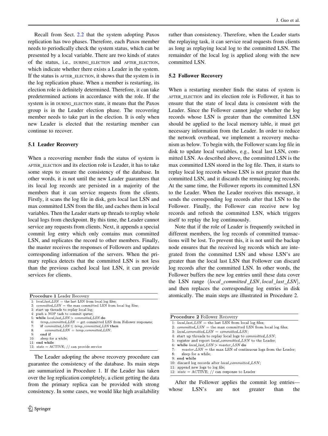 6 . J. Guo et al. Recall from Sect. 2.2 that the system adopting Paxos rather than consistency. Therefore, when the Leader starts replication has two phases. Therefore, each Paxos member the replaying task, it can service read requests from clients needs to periodically check the system status, which can be as long as replaying local log to the committed LSN. The presented by a local variable. There are two kinds of states remainder of the local log is applied along with the new of the status, i.e., DURING_ELECTION and AFTER_ELECTION, committed LSN. which indicate whether there exists a Leader in the system. If the status is AFTER_ELECTION, it shows that the system is in 5.2 Follower Recovery the log replication phase. When a member is restarting, its election role is definitely determined. Therefore, it can take When a restarting member finds the status of system is predetermined actions in accordance with the role. If the AFTER_ELECTION and its election role is Follower, it has to system is in DURING_ELECTION state, it means that the Paxos ensure that the state of local data is consistent with the group is in the Leader election phase. The recovering Leader. Since the Follower cannot judge whether the log member needs to take part in the election. It is only when records whose LSN is greater than the committed LSN new Leader is elected that the restarting member can should be applied to the local memory table, it must get continue to recover. necessary information from the Leader. In order to reduce the network overhead, we implement a recovery mecha- 5.1 Leader Recovery nism as below. To begin with, the Follower scans log file in disk to update local variables, e.g., local last LSN, com- When a recovering member finds the status of system is mitted LSN. As described above, the committed LSN is the AFTER_ELECTION and its election role is Leader, it has to take max committed LSN stored in the log file. Then, it starts to some steps to ensure the consistency of the database. In replay local log records whose LSN is not greater than the other words, it is not until the new Leader guarantees that committed LSN, and it discards the remaining log records. its local log records are persisted in a majority of the At the same time, the Follower reports its committed LSN members that it can service requests from the clients. to the Leader. When the Leader receives this message, it Firstly, it scans the log file in disk, gets local last LSN and sends the corresponding log records after that LSN to the max committed LSN from the file, and caches them in local Follower. Finally, the Follower can receive new log variables. Then the Leader starts up threads to replay whole records and refresh the committed LSN, which triggers local logs from checkpoint. By this time, the Leader cannot itself to replay the log continuously. service any requests from clients. Next, it appends a special Note that if the role of Leader is frequently switched in commit log entry which only contains max committed different members, the log records of committed transac- LSN, and replicates the record to other members. Finally, tions will be lost. To prevent this, it is not until the backup the master receives the responses of Followers and updates node ensures that the received log records which are inte- corresponding information of the servers. When the pri- grated from the committed LSN and whose LSN’s are mary replica detects that the committed LSN is not less greater than the local last LSN that Follower can discard than the previous cached local last LSN, it can provide log records after the committed LSN. In other words, the services for clients. Follower buffers the new log entries until these data cover the LSN range ðlocal committed LSN; local last LSN, and then replaces the corresponding log entries in disk atomically. The main steps are illustrated in Procedure 2. The Leader adopting the above recovery procedure can guarantee the consistency of the database. Its main steps are summarized in Procedure 1. If the Leader has taken over the log replication completely, a client getting the data from the primary replica can be provided with strong After the Follower applies the commit log entries— consistency. In some cases, we would like high availability whose LSN’s are not greater than the 123