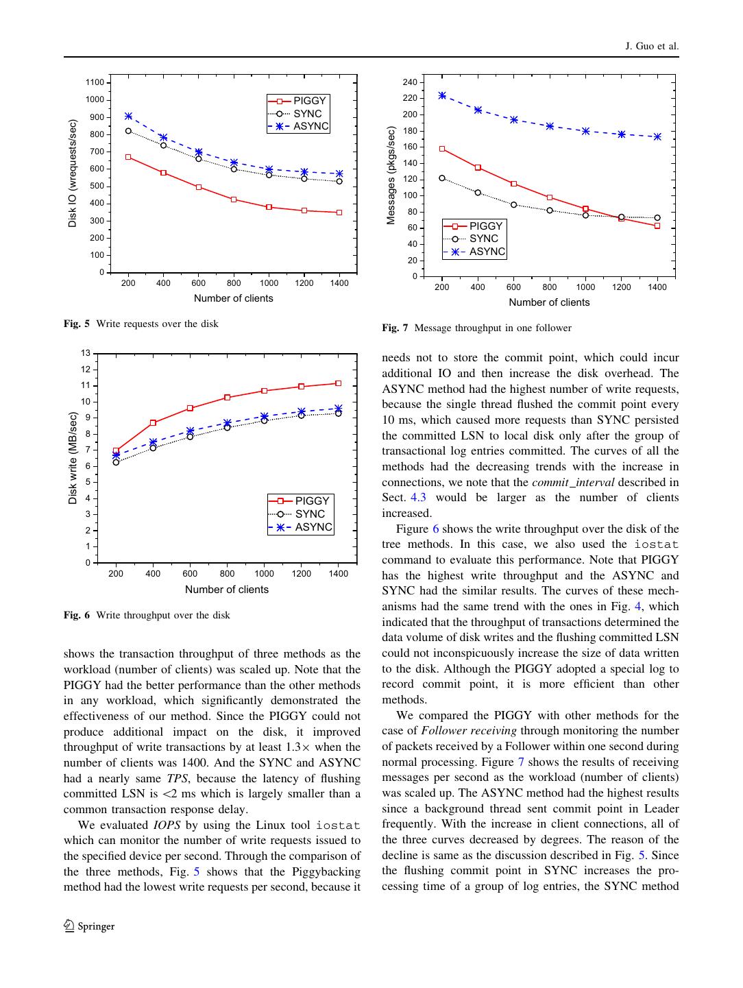 8 . J. Guo et al. 1100 240 1000 PIGGY 220 900 SYNC 200 Disk IO (wrequests/sec) ASYNC 180 Messages (pkgs/sec) 800 160 700 140 600 120 500 100 400 80 300 60 PIGGY 200 40 SYNC 100 ASYNC 20 0 0 200 400 600 800 1000 1200 1400 200 400 600 800 1000 1200 1400 Number of clients Number of clients Fig. 5 Write requests over the disk Fig. 7 Message throughput in one follower 13 needs not to store the commit point, which could incur 12 additional IO and then increase the disk overhead. The 11 ASYNC method had the highest number of write requests, 10 because the single thread flushed the commit point every Disk write (MB/sec) 9 10 ms, which caused more requests than SYNC persisted 8 the committed LSN to local disk only after the group of 7 transactional log entries committed. The curves of all the 6 methods had the decreasing trends with the increase in 5 connections, we note that the commit interval described in 4 PIGGY Sect. 4.3 would be larger as the number of clients 3 SYNC increased. 2 ASYNC Figure 6 shows the write throughput over the disk of the 1 tree methods. In this case, we also used the iostat 0 command to evaluate this performance. Note that PIGGY 200 400 600 800 1000 1200 1400 has the highest write throughput and the ASYNC and Number of clients SYNC had the similar results. The curves of these mech- anisms had the same trend with the ones in Fig. 4, which Fig. 6 Write throughput over the disk indicated that the throughput of transactions determined the data volume of disk writes and the flushing committed LSN shows the transaction throughput of three methods as the could not inconspicuously increase the size of data written workload (number of clients) was scaled up. Note that the to the disk. Although the PIGGY adopted a special log to PIGGY had the better performance than the other methods record commit point, it is more efficient than other in any workload, which significantly demonstrated the methods. effectiveness of our method. Since the PIGGY could not We compared the PIGGY with other methods for the produce additional impact on the disk, it improved case of Follower receiving through monitoring the number throughput of write transactions by at least 1.39 when the of packets received by a Follower within one second during number of clients was 1400. And the SYNC and ASYNC normal processing. Figure 7 shows the results of receiving had a nearly same TPS, because the latency of flushing messages per second as the workload (number of clients) committed LSN is \2 ms which is largely smaller than a was scaled up. The ASYNC method had the highest results common transaction response delay. since a background thread sent commit point in Leader We evaluated IOPS by using the Linux tool iostat frequently. With the increase in client connections, all of which can monitor the number of write requests issued to the three curves decreased by degrees. The reason of the the specified device per second. Through the comparison of decline is same as the discussion described in Fig. 5. Since the three methods, Fig. 5 shows that the Piggybacking the flushing commit point in SYNC increases the pro- method had the lowest write requests per second, because it cessing time of a group of log entries, the SYNC method 123