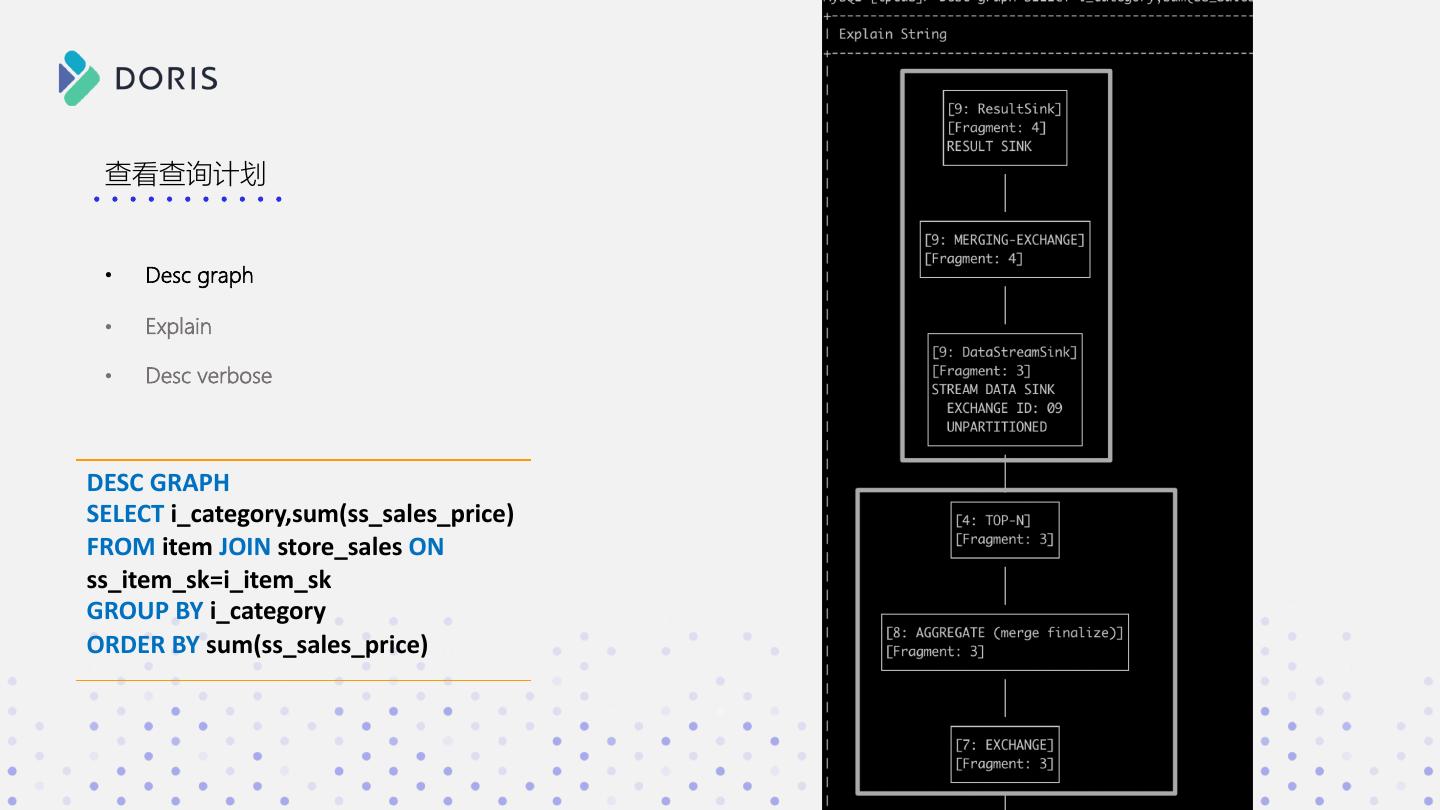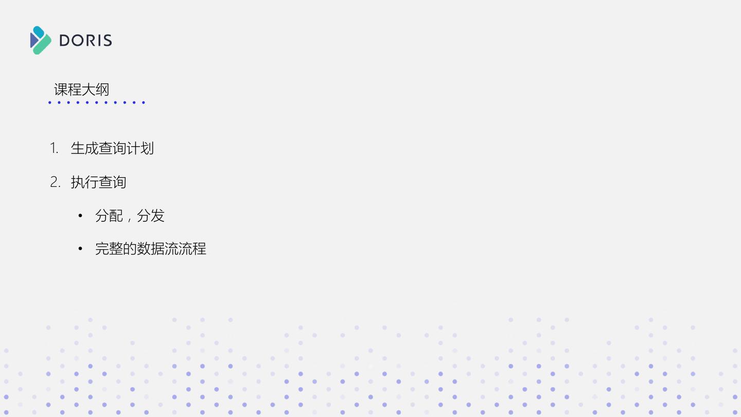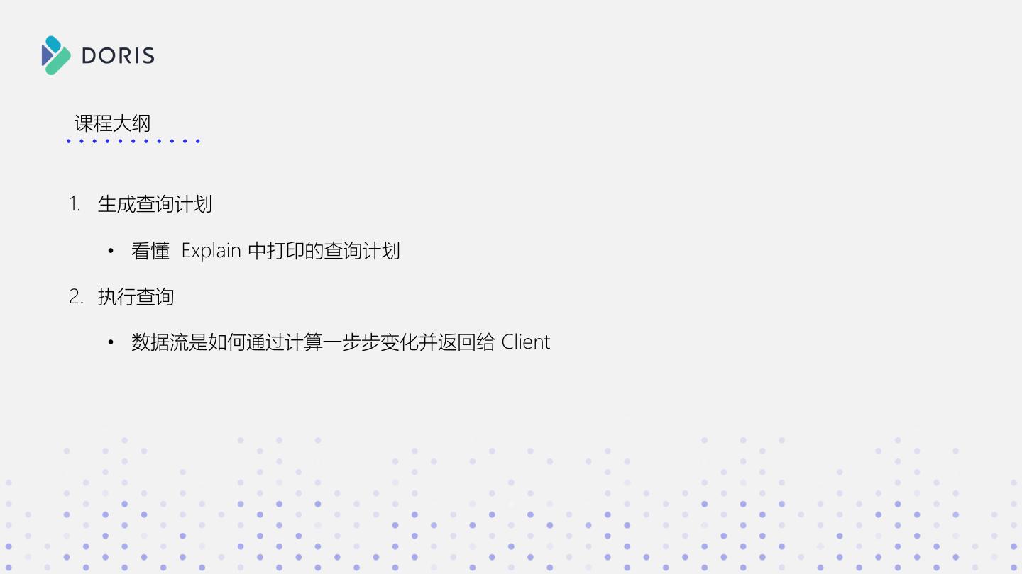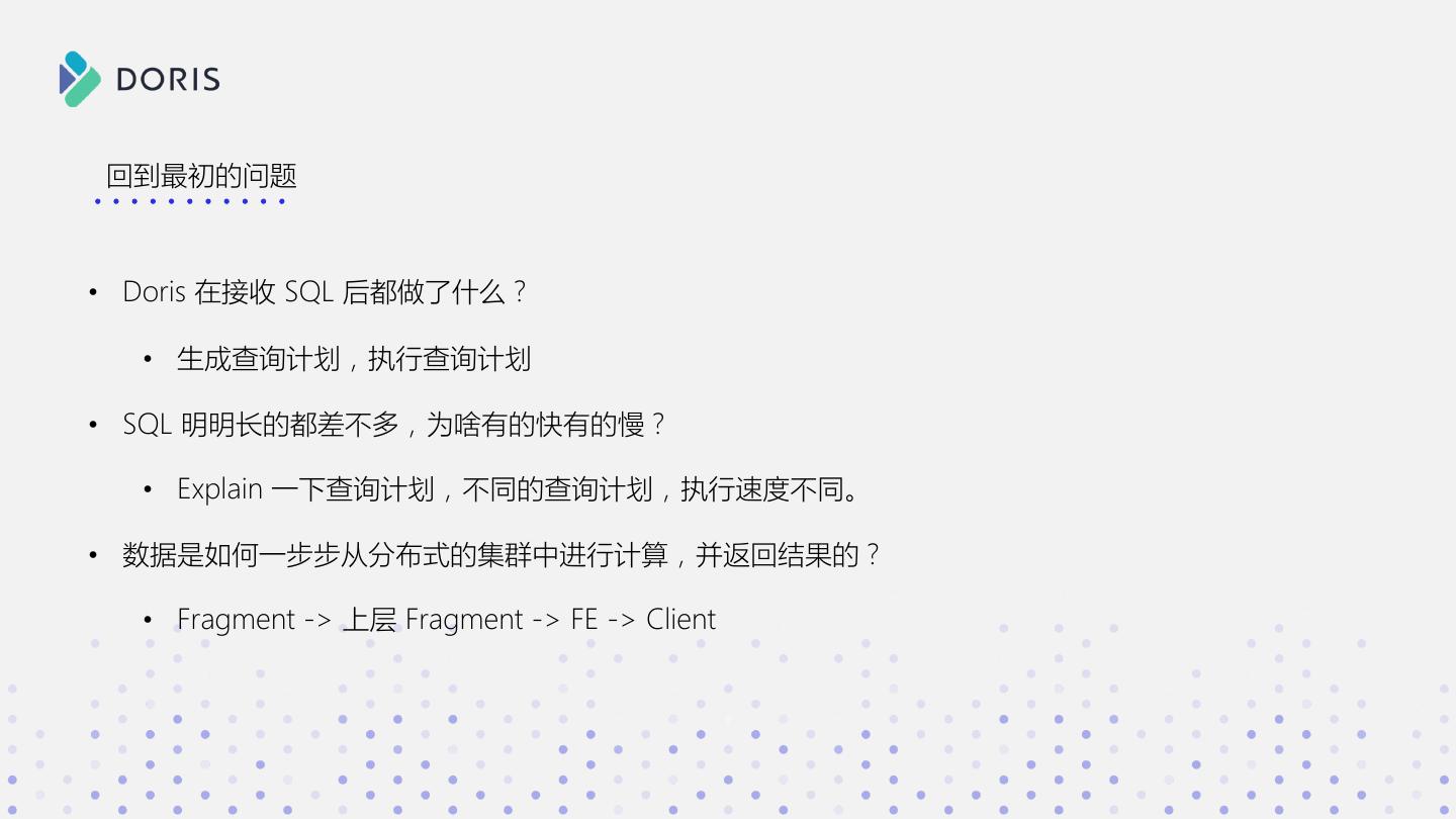 3 . SELECT * FROM xxx a b c WHERE xxx GROUP BY xxx 1 2 3 如果你有如下问题 ORDER BY xxx 2 3 4 • Doris 在接收 SQL 后都做了什么? • SQL 明明长的都差不多,为啥有的快有的慢? • 数据是如何一步步从分布式的集群中进行计算,并返回 Doris 结果的?