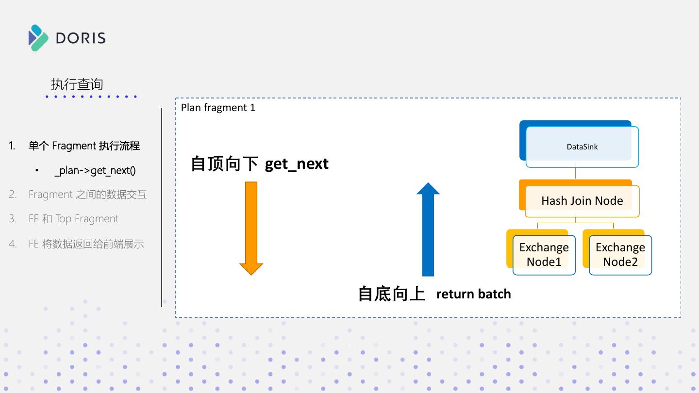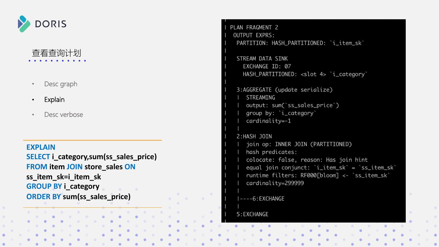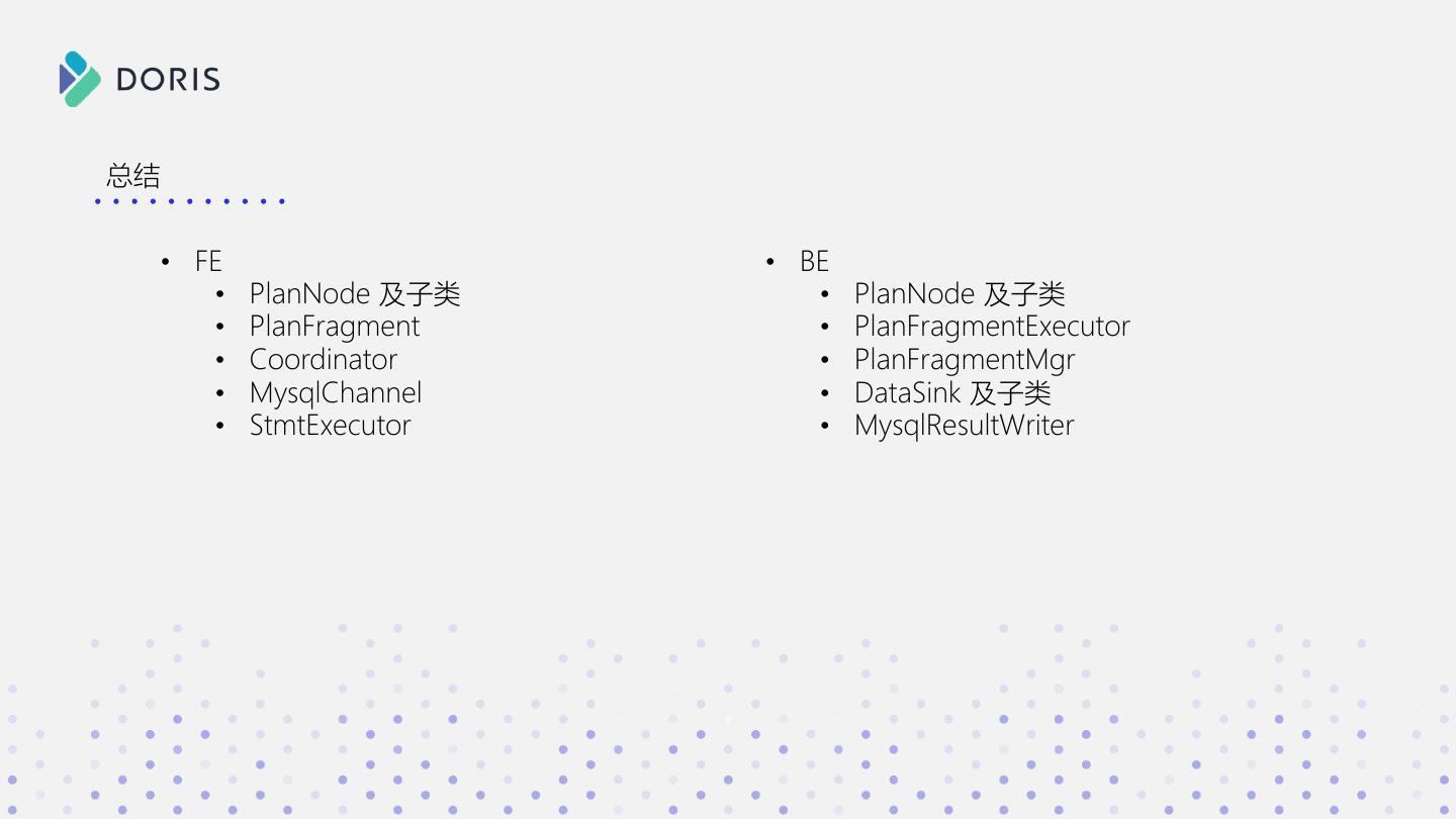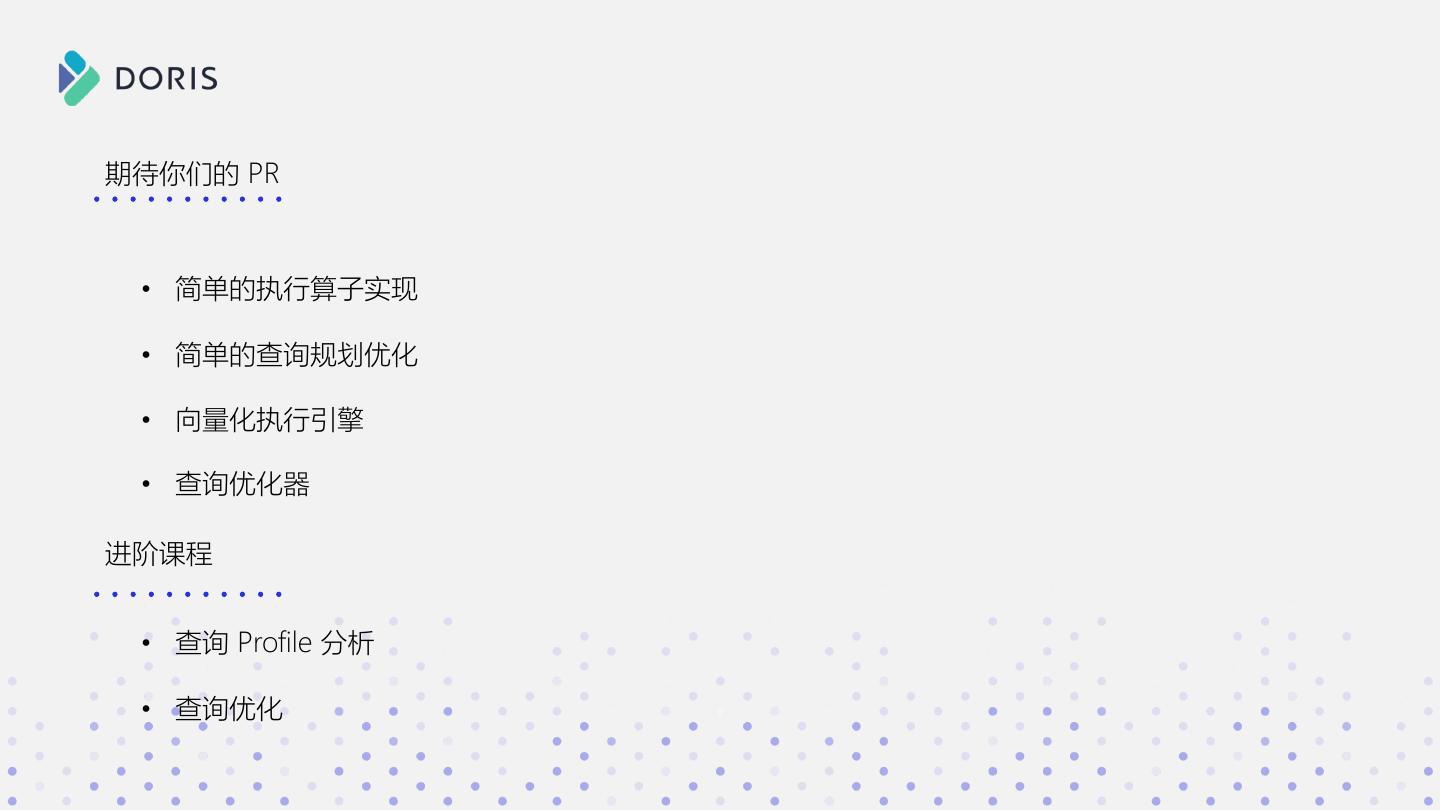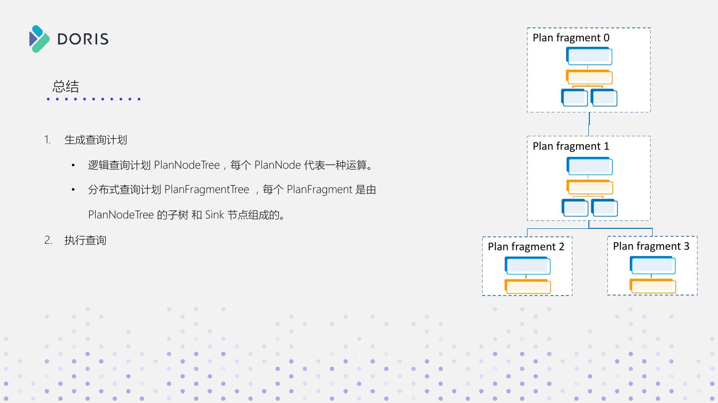 3 . SELECT * FROM xxx a b c WHERE xxx GROUP BY xxx 1 2 3 如果你有如下问题 ORDER BY xxx 2 3 4 • Doris 在接收 SQL 后都做了什么? • SQL 明明长的都差不多,为啥有的快有的慢? • 数据是如何一步步从分布式的集群中进行计算,并返回 Doris 结果的?