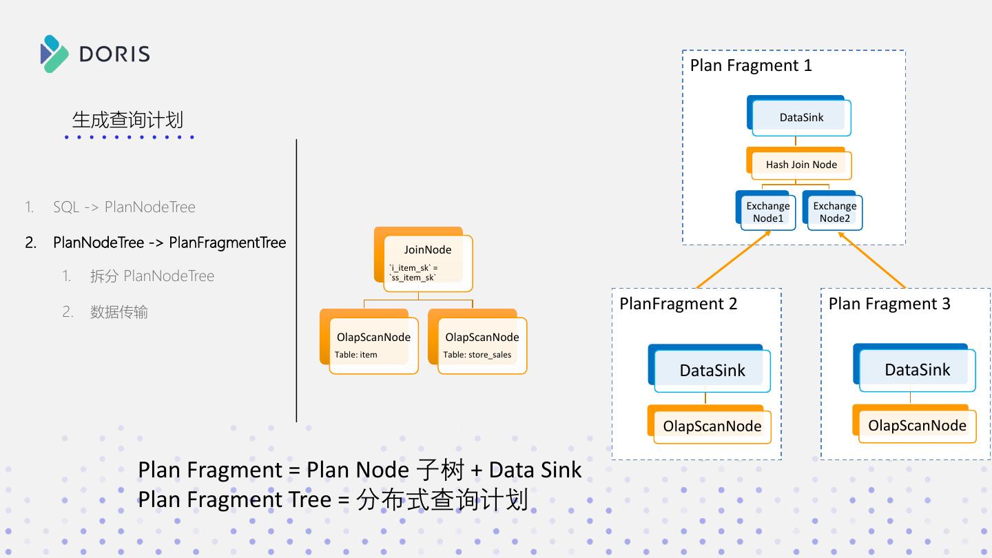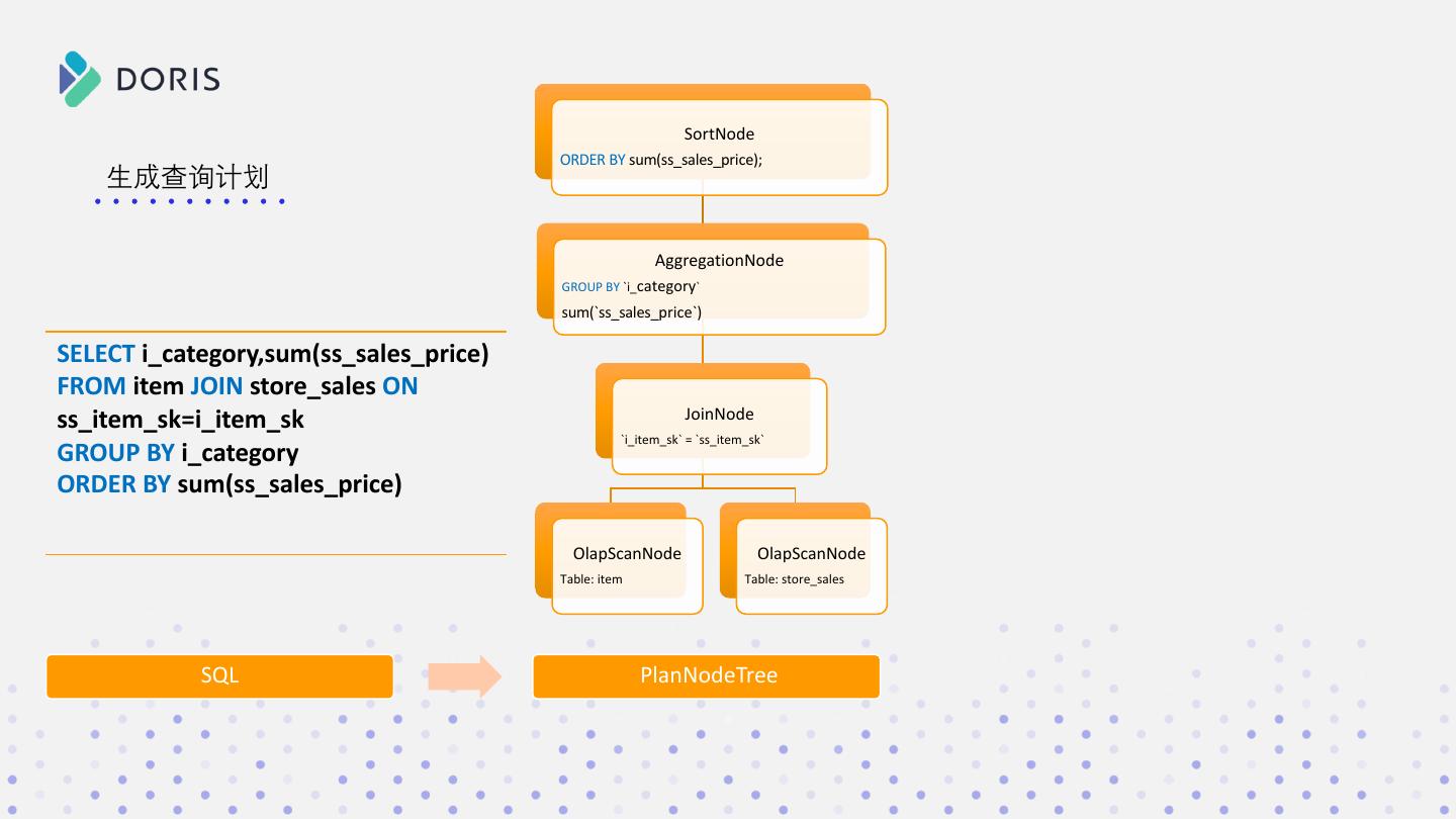 6 . SortNode ORDER BY sum(ss_sales_price); 生成查询计划 SELECT i_category,sum(ss_sales_price) AggregationNode GROUP BY `i_category` 1. SQL -> PlanNodeTree FROM item JOIN store_sales ON sum(`ss_sales_price`) ss_item_sk=i_item_sk 2. PlanNodeTree -> PlanFragmentTree GROUP BY i_category ORDER BY sum(ss_sales_price) JoinNode `i_item_sk` = `ss_item_sk` PlanNode = 逻辑算子 OlapScanNode OlapScanNode PlanNodeTree = 逻辑执行计划 Table: item Table: store_sales