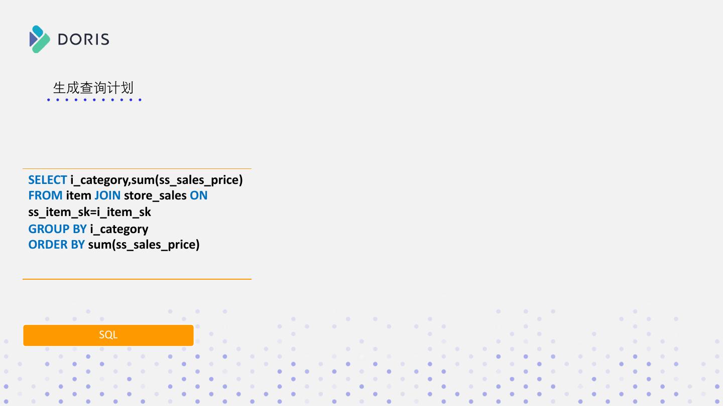 11 . 生成查询计划 SELECT i_category,sum(ss_sales_price) FROM item JOIN store_sales ON ss_item_sk=i_item_sk GROUP BY i_category ORDER BY sum(ss_sales_price) SQL
