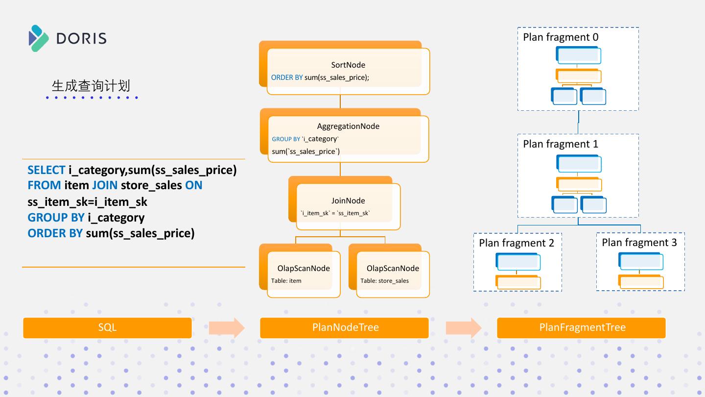 5 . Plan fragment 0 生成查询计划 1. SQL -> PlanNodeTree 2. PlanNodeTree -> PlanFragmentTree Plan fragment 1 SELECT i_category,sum(ss_sales_price) FROM item JOIN store_sales ON ss_item_sk=i_item_sk GROUP BY i_category Plan fragment 2 Plan fragment 3 ORDER BY sum(ss_sales_price)