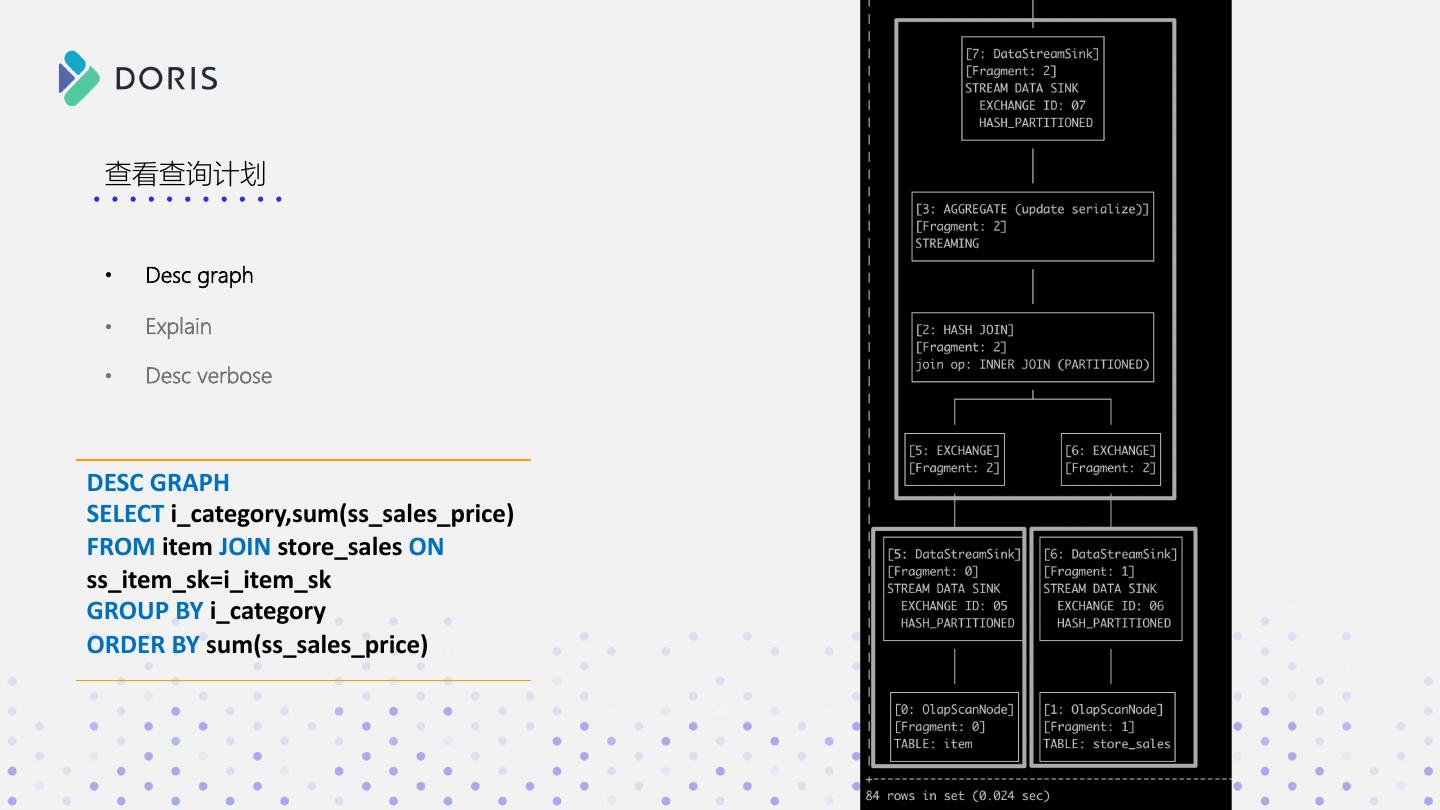 15 . 查看查询计划 • Desc graph • Explain • Desc verbose DESC GRAPH SELECT i_category,sum(ss_sales_price) FROM item JOIN store_sales ON ss_item_sk=i_item_sk GROUP BY i_category ORDER BY sum(ss_sales_price)