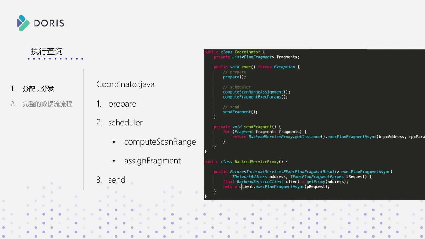18 . 执行查询 1. 分配,分发 Coordinator.java 2. 完整的数据流流程 1. prepare 2. scheduler • computeScanRange • assignFragment 3. send