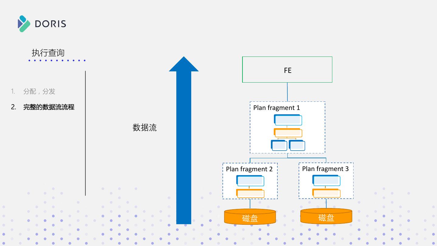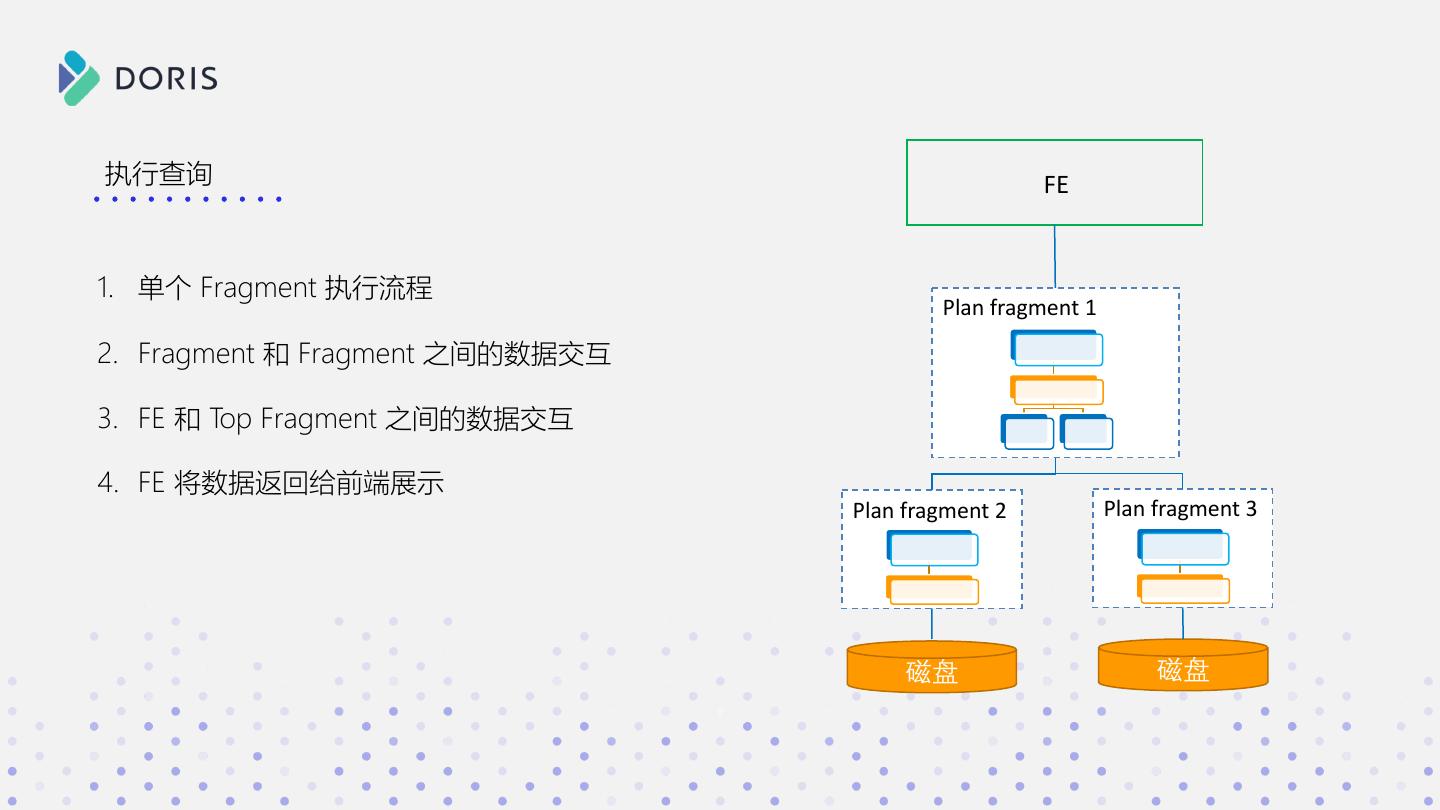 20 .执行查询 FE 1. 单个 Fragment 执行流程 Plan fragment 1 2. Fragment 和 Fragment 之间的数据交互 3. FE 和 Top Fragment 之间的数据交互 4. FE 将数据返回给前端展示 Plan fragment 2 Plan fragment 3 磁盘 磁盘