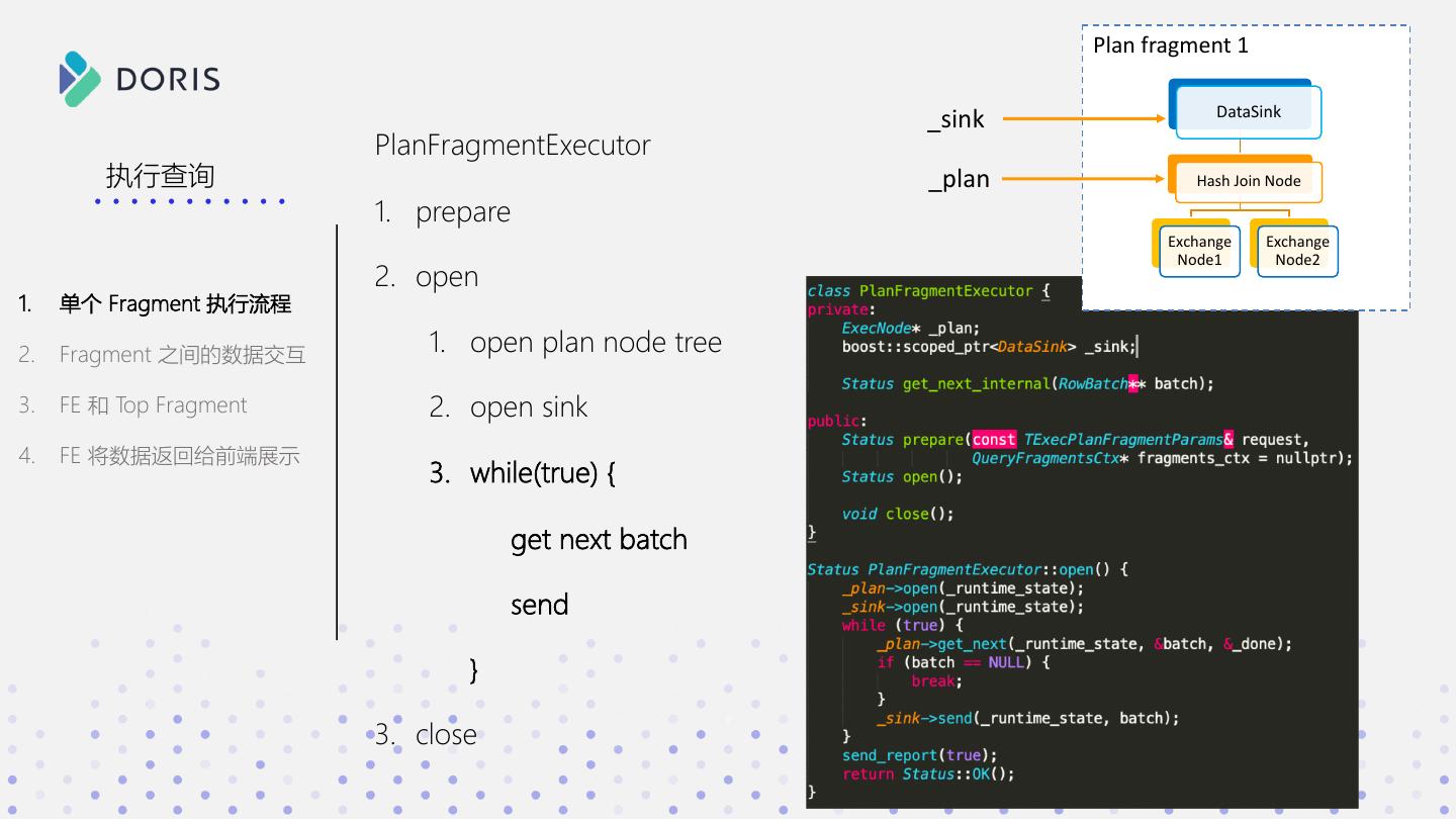 21 . Plan fragment 1 DataSink _sink PlanFragmentExecutor 执行查询 _plan Hash Join Node 1. prepare Exchange Exchange Node1 Node2 2. open 1. 单个 Fragment 执行流程 2. Fragment 之间的数据交互 1. open plan node tree 3. FE 和 Top Fragment 2. open sink 4. FE 将数据返回给前端展示 3. while(true) { get next batch send } 3. close