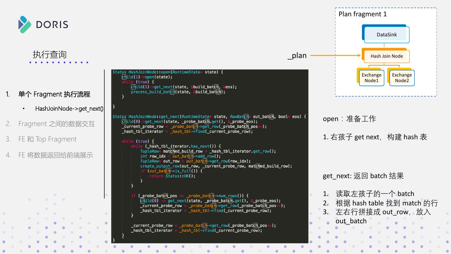 23 . Plan fragment 1 DataSink 执行查询 _plan Hash Join Node Exchange Exchange Node1 Node2 1. 单个 Fragment 执行流程 • HashJoinNode->get_next() open:准备工作 2. Fragment 之间的数据交互 3. FE 和 Top Fragment 1. 右孩子 get next,构建 hash 表 4. FE 将数据返回给前端展示 get_next: 返回 batch 结果 1. 读取左孩子的一个 batch 2. 根据 hash table 找到 match 的行 3. 左右行拼接成 out_row,放入 out_batch