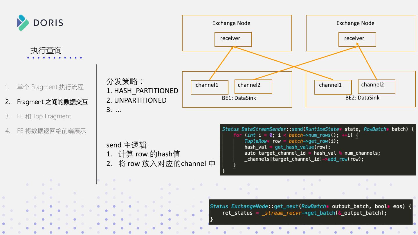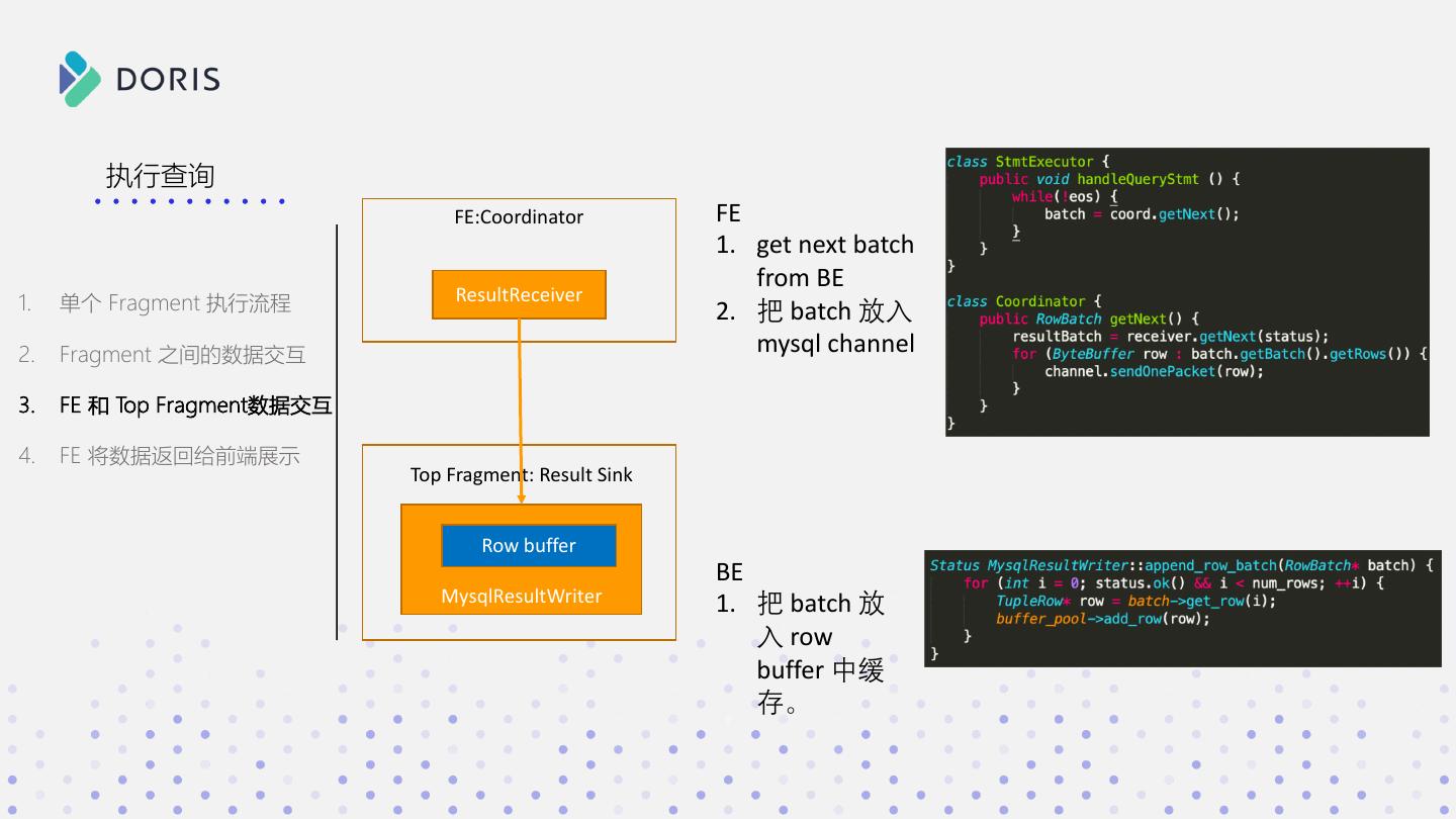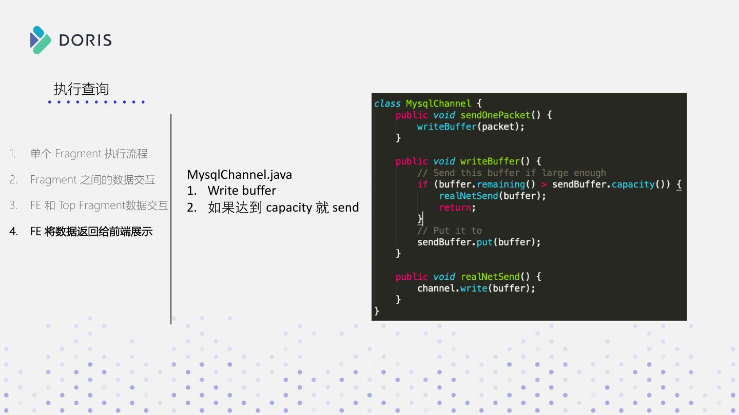 26 . 执行查询 1. 单个 Fragment 执行流程 2. Fragment 之间的数据交互 MysqlChannel.java 1. Write buffer 3. FE 和 Top Fragment数据交互 2. 如果达到 capacity 就 send 4. FE 将数据返回给前端展示