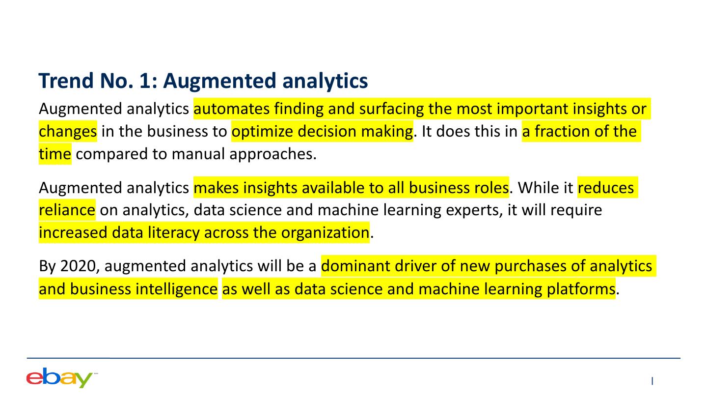 4 .Trend No. 1: Augmented analytics Augmented analytics automates finding and surfacing the most important insights or changes in the business to optimize decision making. It does this in a fraction of the time compared to manual approaches. Augmented analytics makes insights available to all business roles. While it reduces reliance on analytics, data science and machine learning experts, it will require increased data literacy across the organization. By 2020, augmented analytics will be a dominant driver of new purchases of analytics and business intelligence as well as data science and machine learning platforms.