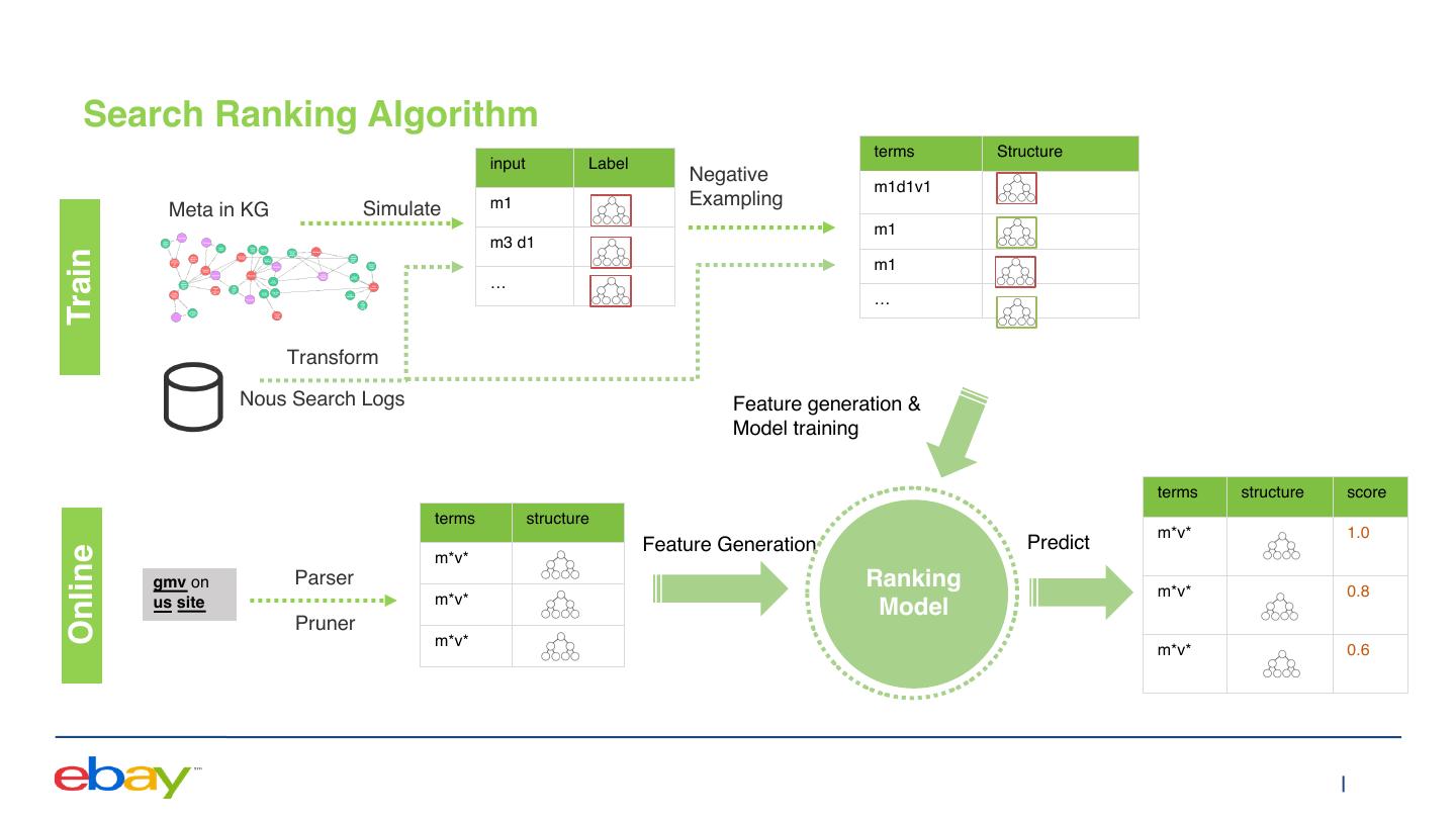19 . Search Ranking Algorithm terms Structure input Label Negative m1d1v1 m1 Exampling Meta in KG Simulate m1 m3 d1 Train m1 … … … … Transform Nous Search Logs Feature generation & Model training terms structure score terms structure m*v* 1.0 Feature Generation Predict Online m*v* gmv on Parser Ranking m*v* 0.8 us site m*v* Model Pruner m*v* m*v* 0.6