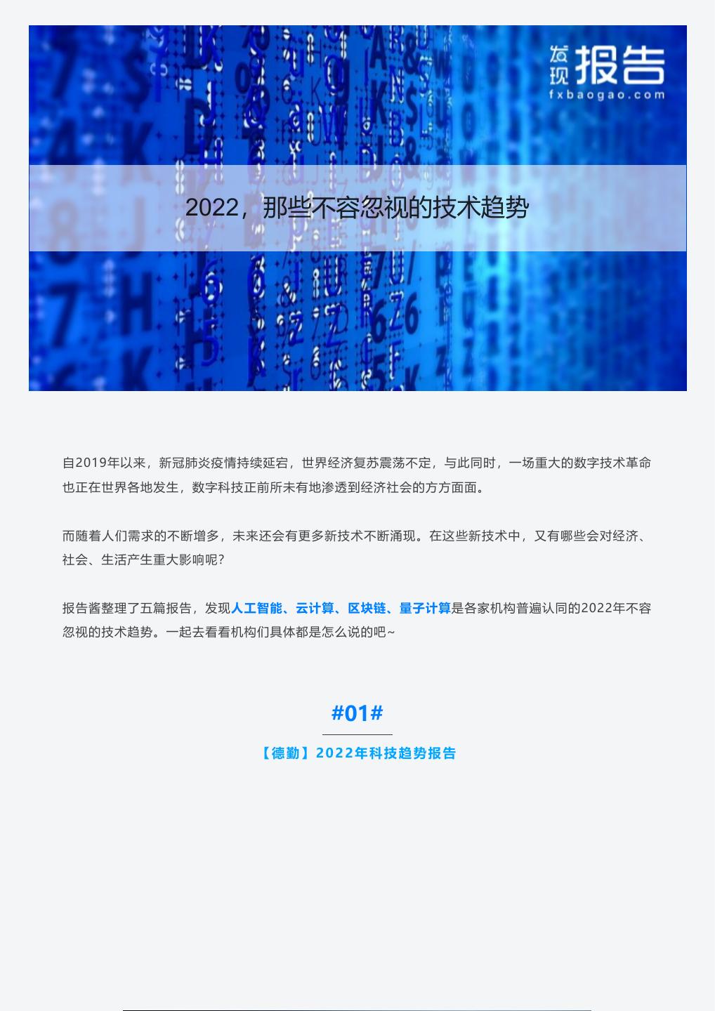 2 . 2022,那些不容忽视的技术趋势 自2019年以来,新冠肺炎疫情持续延宕,世界经济复苏震荡不定,与此同时,一场重大的数字技术革命 也正在世界各地发生,数字科技正前所未有地渗透到经济社会的方方面面。 而随着人们需求的不断增多,未来还会有更多新技术不断涌现。在这些新技术中,又有哪些会对经济、 社会、生活产生重大影响呢? 报告酱整理了五篇报告,发现人工智能、云计算、区块链、量子计算是各家机构普遍认同的2022年不容 忽视的技术趋势。一起去看看机构们具体都是怎么说的吧~ #01# 【德勤】2022年科技趋势报告