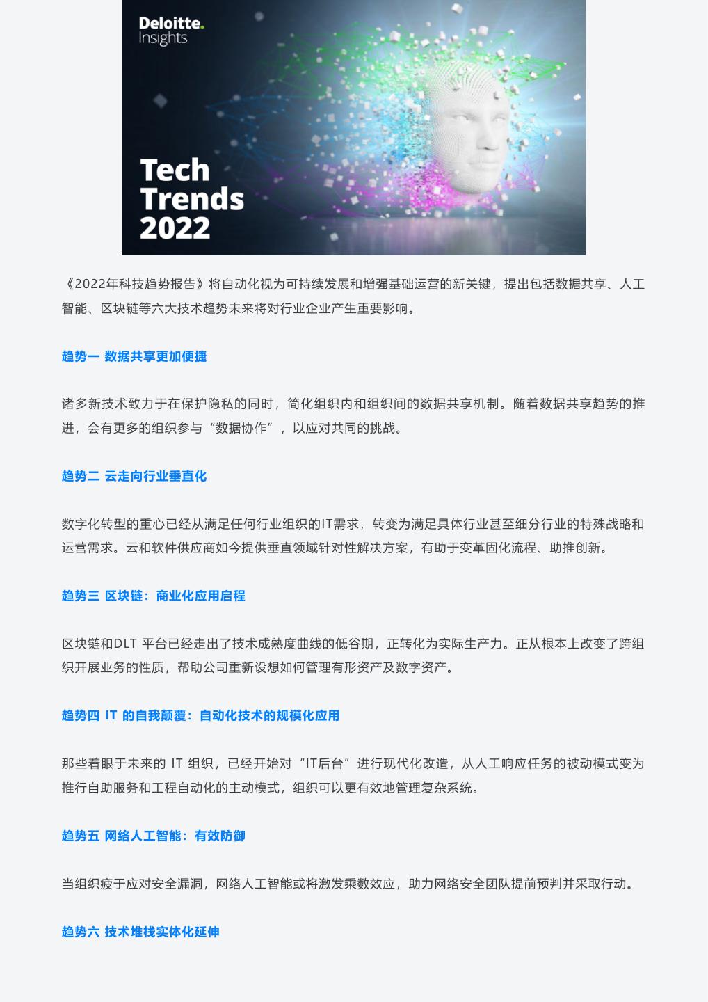 3 .《2022年科技趋势报告》将自动化视为可持续发展和增强基础运营的新关键,提出包括数据共享、人工 智能、区块链等六大技术趋势未来将对行业企业产生重要影响。 趋势一 数据共享更加便捷 诸多新技术致力于在保护隐私的同时,简化组织内和组织间的数据共享机制。随着数据共享趋势的推 进,会有更多的组织参与“数据协作”,以应对共同的挑战。 趋势二 云走向行业垂直化 数字化转型的重心已经从满足任何行业组织的IT需求,转变为满足具体行业甚至细分行业的特殊战略和 运营需求。云和软件供应商如今提供垂直领域针对性解决方案,有助于变革固化流程、助推创新。 趋势三 区块链:商业化应用启程 区块链和DLT 平台已经走出了技术成熟度曲线的低谷期,正转化为实际生产力。正从根本上改变了跨组 织开展业务的性质,帮助公司重新设想如何管理有形资产及数字资产。 趋势四 IT 的自我颠覆:自动化技术的规模化应用 那些着眼于未来的 IT 组织,已经开始对“IT后台”进行现代化改造,从人工响应任务的被动模式变为 推行自助服务和工程自动化的主动模式,组织可以更有效地管理复杂系统。 趋势五 网络人工智能:有效防御 当组织疲于应对安全漏洞,网络人工智能或将激发乘数效应,助力网络安全团队提前预判并采取行动。 趋势六 技术堆栈实体化延伸