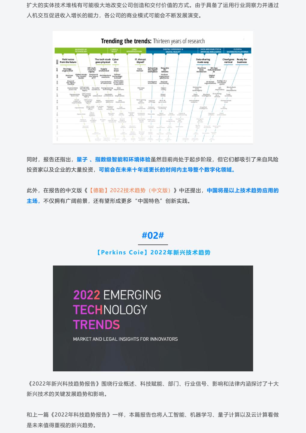 4 .扩大的实体技术堆栈有可能极大地改变公司创造和交付价值的方式。由于具备了运用行业洞察力并通过 人机交互促进收入增长的能力,各公司的商业模式可能会不断发展演变。 同时,报告还指出,量子 、指数级智能和环境体验虽然目前尚处于起步阶段,但它们都吸引了来自风险 投资家以及企业的大量投资,可能会在未来十年或更长的时间内主导整个数字化领域。 此外,在报告的中文版《【德勤】2022技术趋势(中文版)》中还提出,中国将是以上技术趋势应用的 主场,不仅拥有广阔前景,还有望形成更多“中国特色”创新实践。 #02# 【 Pe r k i n s C o i e 】 2 0 2 2 年 新 兴 技 术 趋 势 《2022年新兴科技趋势报告》围绕行业概述、科技赋能、部门、行业信号、影响和法律内涵探讨了十大 新兴技术的关键发展趋势和影响。 和上一篇《2022年科技趋势报告》一样,本篇报告也将人工智能、机器学习、量子计算以及云计算看做 是未来值得重视的新兴趋势。