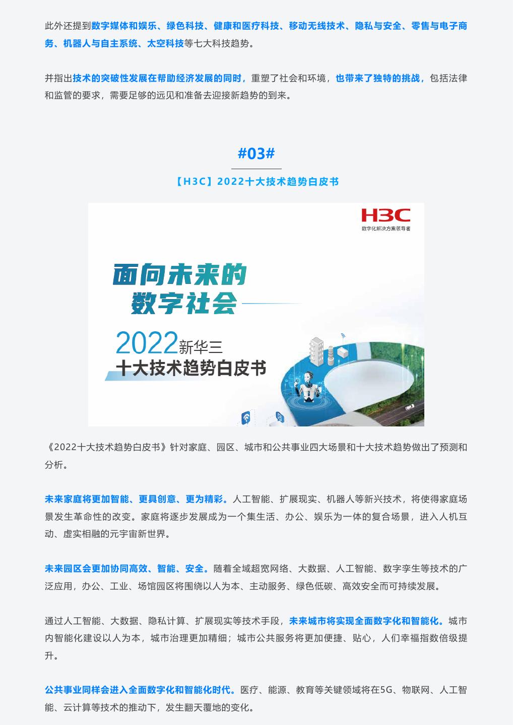 5 .此外还提到数字媒体和娱乐、绿色科技、健康和医疗科技、移动无线技术、隐私与安全、零售与电子商 务、机器人与自主系统、太空科技等七大科技趋势。 并指出技术的突破性发展在帮助经济发展的同时,重塑了社会和环境,也带来了独特的挑战,包括法律 和监管的要求,需要足够的远见和准备去迎接新趋势的到来。 #03# 【H3C】2022十大技术趋势白皮书 《2022十大技术趋势白皮书》针对家庭、园区、城市和公共事业四大场景和十大技术趋势做出了预测和 分析。 未来家庭将更加智能、更具创意、更为精彩。人工智能、扩展现实、机器人等新兴技术,将使得家庭场 景发生革命性的改变。家庭将逐步发展成为一个集生活、办公、娱乐为一体的复合场景,进入人机互 动、虚实相融的元宇宙新世界。 未来园区会更加协同高效、智能、安全。随着全域超宽网络、大数据、人工智能、数字孪生等技术的广 泛应用,办公、工业、场馆园区将围绕以人为本、主动服务、绿色低碳、高效安全而可持续发展。 通过人工智能、大数据、隐私计算、扩展现实等技术手段,未来城市将实现全面数字化和智能化。城 市 内智能化建设以人为本,城市治理更加精细;城市公共服务将更加便捷、贴心,人们幸福指数倍级提 升。 公共事业同样会进入全面数字化和智能化时代。医疗、能源、教育等关键领域将在5G、物联网、人工智 能、云计算等技术的推动下,发生翻天覆地的变化。