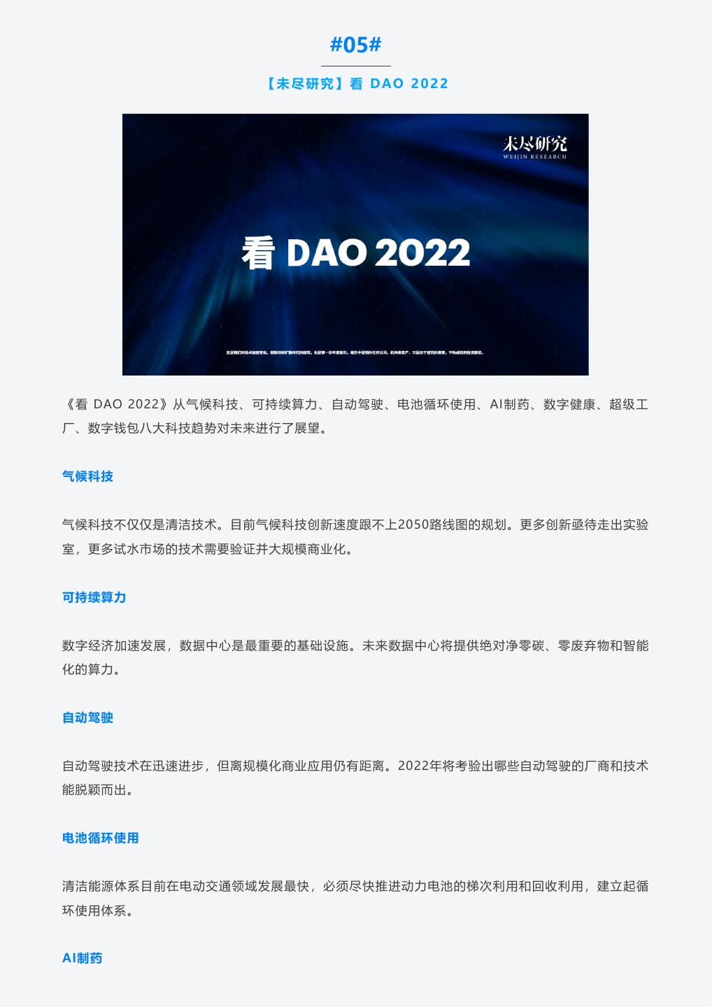 7 . #05# 【未尽研究】看 DAO 2022 《看 DAO 2022》从气候科技、可持续算力、自动驾驶、电池循环使用、AI制药、数字健康、超级工 厂、数字钱包八大科技趋势对未来进行了展望。 气候科技 气候科技不仅仅是清洁技术。目前气候科技创新速度跟不上2050路线图的规划。更多创新亟待走出实验 室,更多试水市场的技术需要验证并大规模商业化。 可持续算力 数字经济加速发展,数据中心是最重要的基础设施。未来数据中心将提供绝对净零碳、零废弃物和智能 化的算力。 自动驾驶 自动驾驶技术在迅速进步,但离规模化商业应用仍有距离。2022年将考验出哪些自动驾驶的厂商和技术 能脱颖而出。 电池循环使用 清洁能源体系目前在电动交通领域发展最快,必须尽快推进动力电池的梯次利用和回收利用,建立起循 环使用体系。 AI制药
