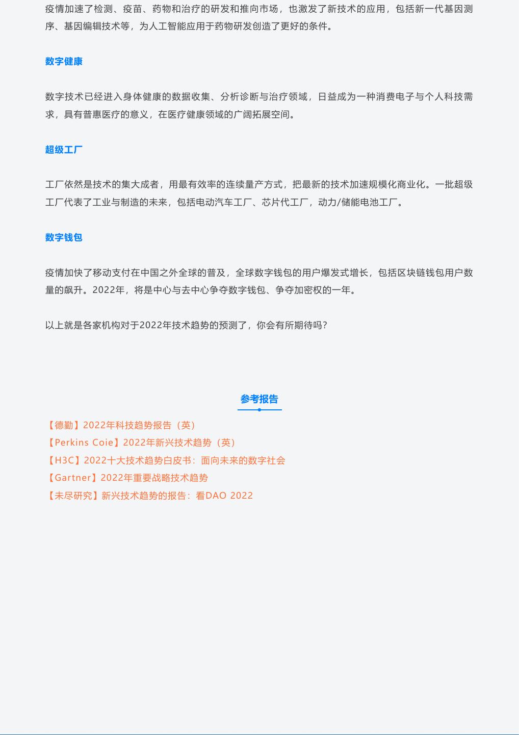 8 .疫情加速了检测、疫苗、药物和治疗的研发和推向市场,也激发了新技术的应用,包括新一代基因测 序、基因编辑技术等,为人工智能应用于药物研发创造了更好的条件。 数字健康 数字技术已经进入身体健康的数据收集、分析诊断与治疗领域,日益成为一种消费电子与个人科技需 求,具有普惠医疗的意义,在医疗健康领域的广阔拓展空间。 超级工厂 工厂依然是技术的集大成者,用最有效率的连续量产方式,把最新的技术加速规模化商业化。一批超级 工厂代表了工业与制造的未来,包括电动汽车工厂、芯片代工厂,动力/储能电池工厂。 数字钱包 疫情加快了移动支付在中国之外全球的普及,全球数字钱包的用户爆发式增长,包括区块链钱包用户数 量的飙升。2022年,将是中心与去中心争夺数字钱包、争夺加密权的一年。 以上就是各家机构对于2022年技术趋势的预测了,你会有所期待吗? 参考报告 【德勤】2022年科技趋势报告(英) 【Perkins Coie】2022年新兴技术趋势(英) 【H3C】2022十大技术趋势白皮书:面向未来的数字社会 【Gar tner】2022年重要战略技术趋势 【未尽研究】新兴技术趋势的报告:看DAO 2022