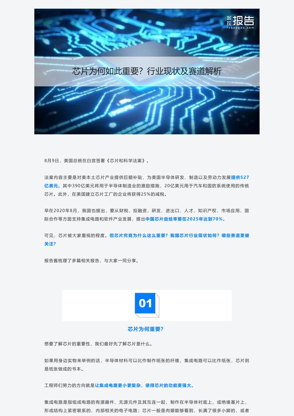 2 . 芯片为何如此重要?行业现状及赛道解析 8月9日,美国总统在白宫签署《芯片和科学法案》。 法案内容主要是对美本土芯片产业提供巨额补贴,为美国半导体研发、制造以及劳动力发展提供527 亿美元。其中390亿美元将用于半导体制造业的激励措施,20亿美元用于汽车和国防系统使用的传统 芯片。此外,在美国建立芯片工厂的企业将获得25%的减税。 早在2020年8月,我国也提出,要从财税、投融资、研发、进出口、人才、知识产权、市场应用、国 际合作等方面支持集成电路和软件产业发展,提出中国芯片自给率要在2025年达到70%。 可见,芯片被大家重视的程度。但芯片究竟为什么这么重要?我国芯片行业现状如何?哪些赛道更被 关注? 报告酱梳理了多篇相关报告,与大家一同分享。 芯片为何重要? 想要了解芯片的重要性,我们最好先了解芯片是什么。 如果用身边实物来举例的话,半导体材料可以比作制作纸张的纤维,集成电路可以比作纸张,芯片则 是纸张做成的书本。 工程师们努力的方向就是让集成电路更小更复杂,使得芯片的功能更强大。 集成电路是指组成电路的有源器件、无源元件及其互连一起,制作在半导体衬底上,或绝缘基片上, 形成结构上紧密联系的、内部相关的电子电路;芯片一般是肉眼能够看到、长满了很多小脚的,或者