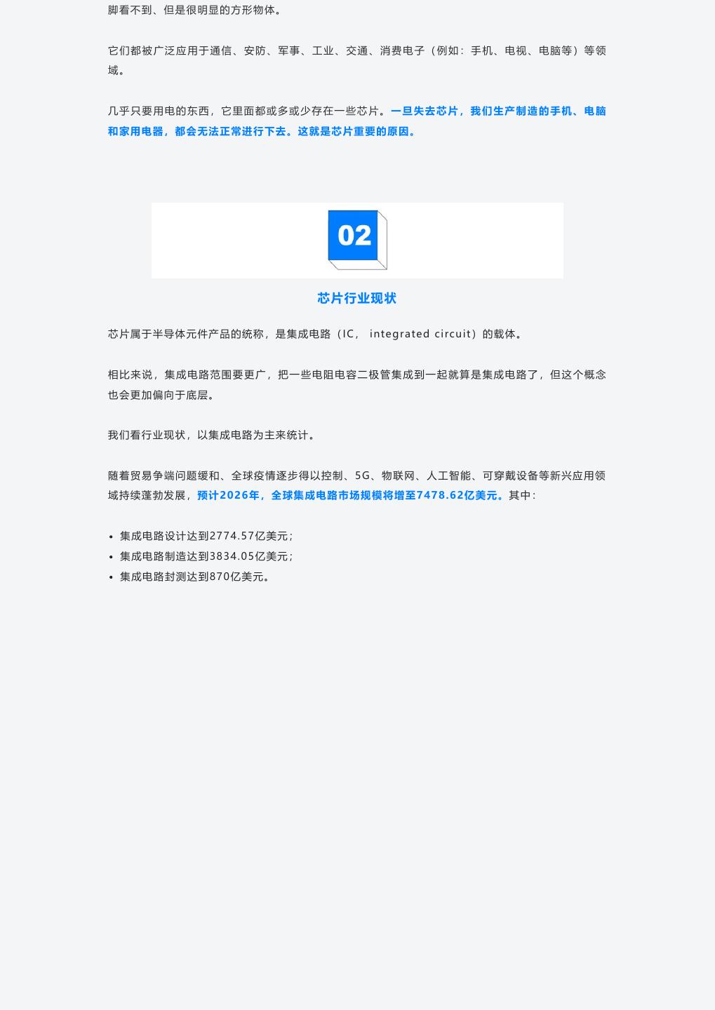 3 .脚看不到、但是很明显的方形物体。 它们都被广泛应用于通信、安防、军事、工业、交通、消费电子(例如:手机、电视、电脑等)等领 域。 几乎只要用电的东西,它里面都或多或少存在一些芯片。一旦失去芯片,我们生产制造的手机、电脑 和家用电器,都会无法正常进行下去。这就是芯片重要的原因。 芯片行业现状 芯 片 属 于 半 导 体 元 件 产 品 的 统 称 , 是 集 成 电 路 ( I C , i n te g r a te d c i rc u i t ) 的 载 体 。 相比来说,集成电路范围要更广,把一些电阻电容二极管集成到一起就算是集成电路了,但这个概念 也会更加偏向于底层。 我们看行业现状,以集成电路为主来统计。 随着贸易争端问题缓和、全球疫情逐步得以控制、5G、物联网、人工智能、可穿戴设备等新兴应用领 域持续蓬勃发展,预计2026年,全球集成电路市场规模将增至7478.62亿美元。其中: 集成电路设计达到2774.57亿美元; 集成电路制造达到3834.05亿美元; 集成电路封测达到870亿美元。