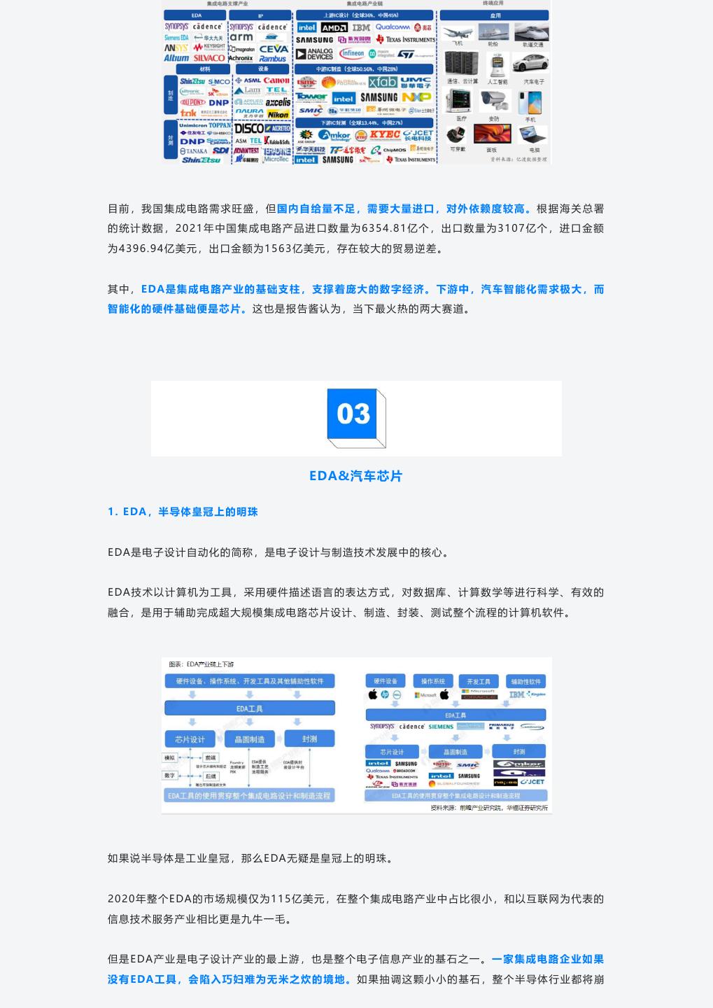 5 .目前,我国集成电路需求旺盛,但国内自给量不足,需要大量进口,对外依赖度较高。根据海关总署 的统计数据,2021年中国集成电路产品进口数量为6354.81亿个,出口数量为3107亿个,进口金额 为4396.94亿美元,出口金额为1563亿美元,存在较大的贸易逆差。 其 中 , E DA 是 集 成 电 路 产 业 的 基 础 支 柱 , 支 撑 着 庞 大 的 数 字 经 济 。 下 游 中 , 汽 车 智 能 化 需 求 极 大 , 而 智能化的硬件基础便是芯片。这也是报告酱认为,当下最火热的两大赛道。 EDA&汽车芯片 1 . E DA , 半 导 体 皇 冠 上 的 明 珠 E DA 是 电 子 设 计 自 动 化 的 简 称 , 是 电 子 设 计 与 制 造 技 术 发 展 中 的 核 心 。 E DA 技 术 以 计 算 机 为 工 具 , 采 用 硬 件 描 述 语 言 的 表 达 方 式 , 对 数 据 库 、 计 算 数 学 等 进 行 科 学 、 有 效 的 融合,是用于辅助完成超大规模集成电路芯片设计、制造、封装、测试整个流程的计算机软件。 如 果 说 半 导 体 是 工 业 皇 冠 , 那 么 E DA 无 疑 是 皇 冠 上 的 明 珠 。 2 0 2 0 年 整 个 E DA 的 市 场 规 模 仅 为 1 1 5 亿 美 元 , 在 整 个 集 成 电 路 产 业 中 占 比 很 小 , 和 以 互 联 网 为 代 表 的 信息技术服务产业相比更是九牛一毛。 但 是 E DA 产 业 是 电 子 设 计 产 业 的 最 上 游 , 也 是 整 个 电 子 信 息 产 业 的 基 石 之 一 。 一 家 集 成 电 路 企 业 如 果 没 有 E DA 工 具 , 会 陷 入 巧 妇 难 为 无 米 之 炊 的 境 地 。 如 果 抽 调 这 颗 小 小 的 基 石 , 整 个 半 导 体 行 业 都 将 崩