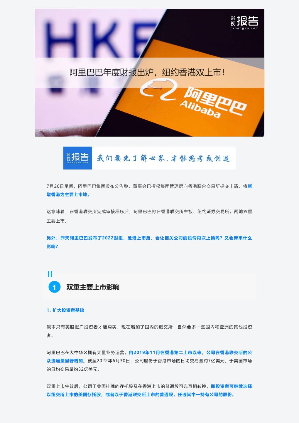 2 . 阿里巴巴年度财报出炉,纽约香港双上市! 7月26日早间,阿里巴巴集团发布公告称,董事会已授权集团管理层向香港联合交易所提交申请,将新 增香港为主要上市地。 这意味着,在香港联交所完成审核程序后,阿里巴巴将在香港联交所主板、纽约证券交易所,两地双重 主要上市。 另外,昨天阿里巴巴发布了2022财报,赴港上市后,会让相关公司的股价再次上扬吗?又会带来什么 影响? 1 双重主要上市影响 1. 扩大投资者基础 原本只有美股账户投资者才能购买,现在增加了国内的港交所,自然会多一些国内和亚洲的其他投资 者。 阿里巴巴在大中华区拥有大量业务运营,自2019年11月在香港第二上市以来,公司在香港联交所的公 众流通量显著增加。截至2022年6月30日,公司股份于香港市场的日均交易量约7亿美元,于美国市场 的日均交易量约32亿美元。 双重上市生效后,公司于美国挂牌的存托股及在香港上市的普通股可以互相转换,即投资者可继续选择 以纽交所上市的美国存托股,或者以于香港联交所上市的普通股,任选其中一持有公司的股份。