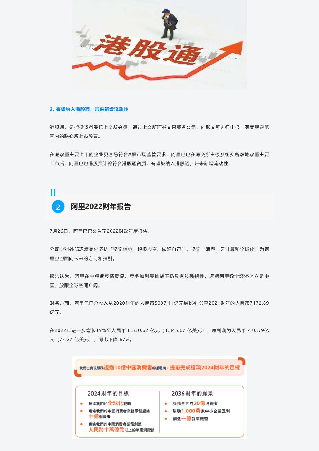 3 .2. 有望纳入港股通,带来新增流动性 港股通,是指投资者委托上交所会员,通过上交所证券交易服务公司,向联交所进行申报,买卖规定范 围内的联交所上市股票。 在港双重主要上市的企业更容易符合A股市场监管要求,阿里巴巴在港交所主板及纽交所双地双重主要 上市后,阿里巴巴港股预计将符合港股通资质,有望被纳入港股通,带来新增流动性。 2 阿里2022财年报告 7月26日,阿里巴巴公告了2022财政年度报告。 公司应对外部环境变化坚持“坚定信心、积极应变、做好自己”,坚定“消费、云计算和全球化”为阿 里巴巴面向未来的方向和指引。 报告认为,阿里在中短期疫情反复、竞争加剧等挑战下仍具有较强韧性,远期阿里数字经济体立足中 国、放眼全球空间广阔。 财务方面,阿里巴巴总收入从2020财年的人民币5097.11亿元增长41%至2021财年的人民币7172.89 亿元。 在2022年进一步增长19%至人民币 8,530.62 亿元(1,345.67 亿美元),净利润为人民币 470.79亿 元(74.27 亿美元),同比下降 67%。