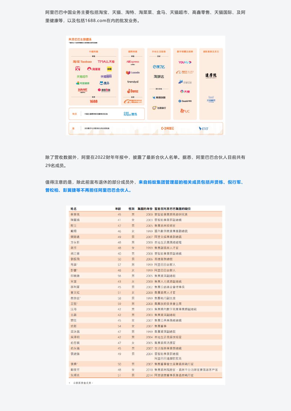 4 .阿里巴巴中国业务主要包括淘宝、天猫、淘特、淘菜菜、盒马、天猫超市、高鑫零售、天猫国际、及阿 里健康等,以及包括1688.com在内的批发业务。 除了营收数据外,阿里在2022财年年报中,披露了最新合伙人名单。据悉,阿里巴巴合伙人目前共有 29名成员。 值得注意的是,除此前宣布退休的部分成员外,来自蚂蚁集团管理层的相关成员包括井贤栋、倪行军、 曾松柏、彭翼捷等不再担任阿里巴巴合伙人。
