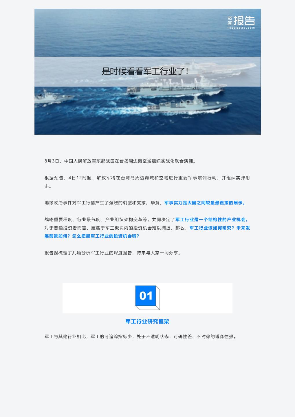 2 . 是时候看看军工行业了! 8月3日,中国人民解放军东部战区在台岛周边海空域组织实战化联合演训。 根 据 预 告 , 4 日 12 时 起 , 解 放 军 将 在 台 湾 岛 周 边 海 域 和 空 域 进 行 重 要 军 事 演 训 行 动 , 并 组 织 实 弹 射 击。 地缘政治事件对军工行情产生了强烈的刺激和支撑。毕竟,军事实力是大国之间较量最直接的展示。 战略重要程度、行业景气度、产业组织架构变革等,共同决定了军工行业是一个结构性的产业机会。 对于普通投资者而言,蕴藏于军工板块内的投资机会难以捕捉。那么,军工行业该如何研究?未来发 展前景如何?怎么把握军工行业的投资机会呢? 报告酱梳理了几篇分析军工行业的深度报告,特来与大家一同分享。 军工行业研究框架 军工与其他行业相比,军工的可追踪指标少,处于不透明状态,可研性差、不对称的博弈性强。