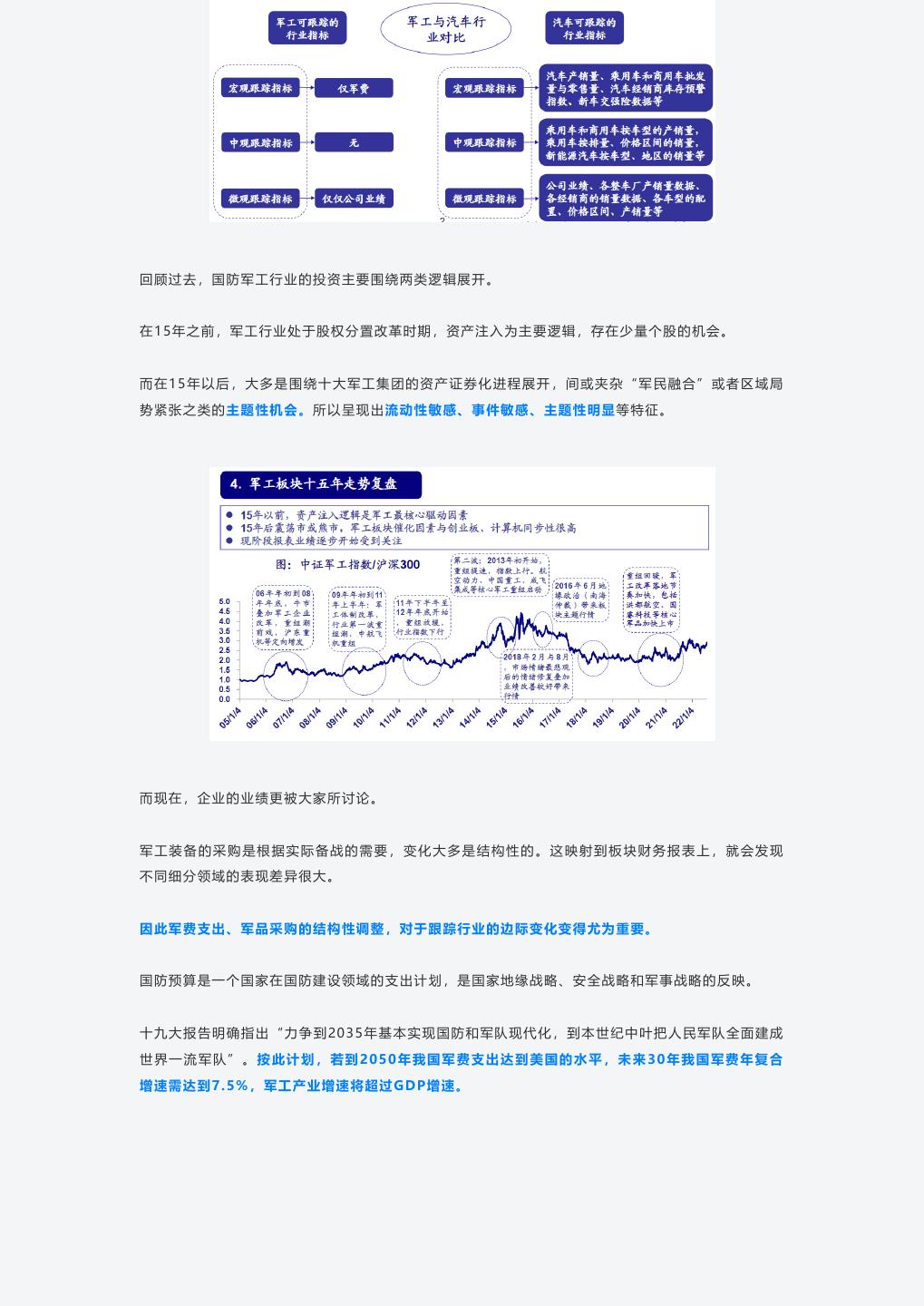 3 .回顾过去,国防军工行业的投资主要围绕两类逻辑展开。 在15年之前,军工行业处于股权分置改革时期,资产注入为主要逻辑,存在少量个股的机会。 而在15年以后,大多是围绕十大军工集团的资产证券化进程展开,间或夹杂“军民融合”或者区域局 势紧张之类的主题性机会。所以呈现出流动性敏感、事件敏感、主题性明显等特征。 而现在,企业的业绩更被大家所讨论。 军工装备的采购是根据实际备战的需要,变化大多是结构性的。这映射到板块财务报表上,就会发现 不同细分领域的表现差异很大。 因此军费支出、军品采购的结构性调整,对于跟踪行业的边际变化变得尤为重要。 国防预算是一个国家在国防建设领域的支出计划,是国家地缘战略、安全战略和军事战略的反映。 十九大报告明确指出“力争到2035年基本实现国防和军队现代化,到本世纪中叶把人民军队全面建成 世界一流军队”。按此计划,若到2050年我国军费支出达到美国的水平,未来30年我国军费年复合 增速需达到7.5%,军工产业增速将超过GDP增速。