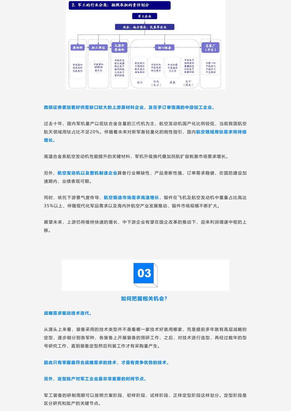 5 .西部证券更加看好供需缺口较大的上游原材料企业,及在手订单饱满的中游加工企业。 过去十年,国内军机量产以低钛合金含量的三代机为主,航空发动机国产化比例较低,当前我国航空 航天领域用钛占比不足20%。伴随着未来对新军备轻量化的刚性指引,国内航空领域用钛需求将持续 增长。 高温合金系航空发动机性能提升的关键材料,军机升级换代叠加民航扩容刺激市场需求增长。 另外,航空发动机以及整机制造企业具备行业稀缺性,产品垄断性强,订单需求稳健,在国防建设加 速期内,业绩表现可期。 同时,依托下游景气度传导,航空锻造市场需求高速增长,锻件在飞机及航空发动机中重量占比高达 35%以上,伴随现代化军品需求以及海内外航空产业发展推动,锻件市场规模不断扩大。 展望未来,上游仍将维持快速的增长,中下游企业有望在国企改革的推动下,迎来利润增速中枢的上 移。 如何把握相关机会? 战略需求驱动技术迭代。 从源头上来看,装备采用的技术类型并不是看哪一家技术好就用哪家,而是提前多年就有高层战略的 定型,逐步细分到各军种、各装备上开展装备的预研工作,之后,对技术进行选型,再经过数年的型 号研究工作,直到装备定型然后列装工作才有采购量产生。 因此只有掌握最符合战略需求的技术,才是有竞争优势的技术。 另外,定型批产对军工企业是非常重要的时间节点。 军工装备的研制周期可以按照方案阶段、初样阶段、试样阶段、正样定型阶段这样划分。定型阶段是 区分研究和批产的关键节点。