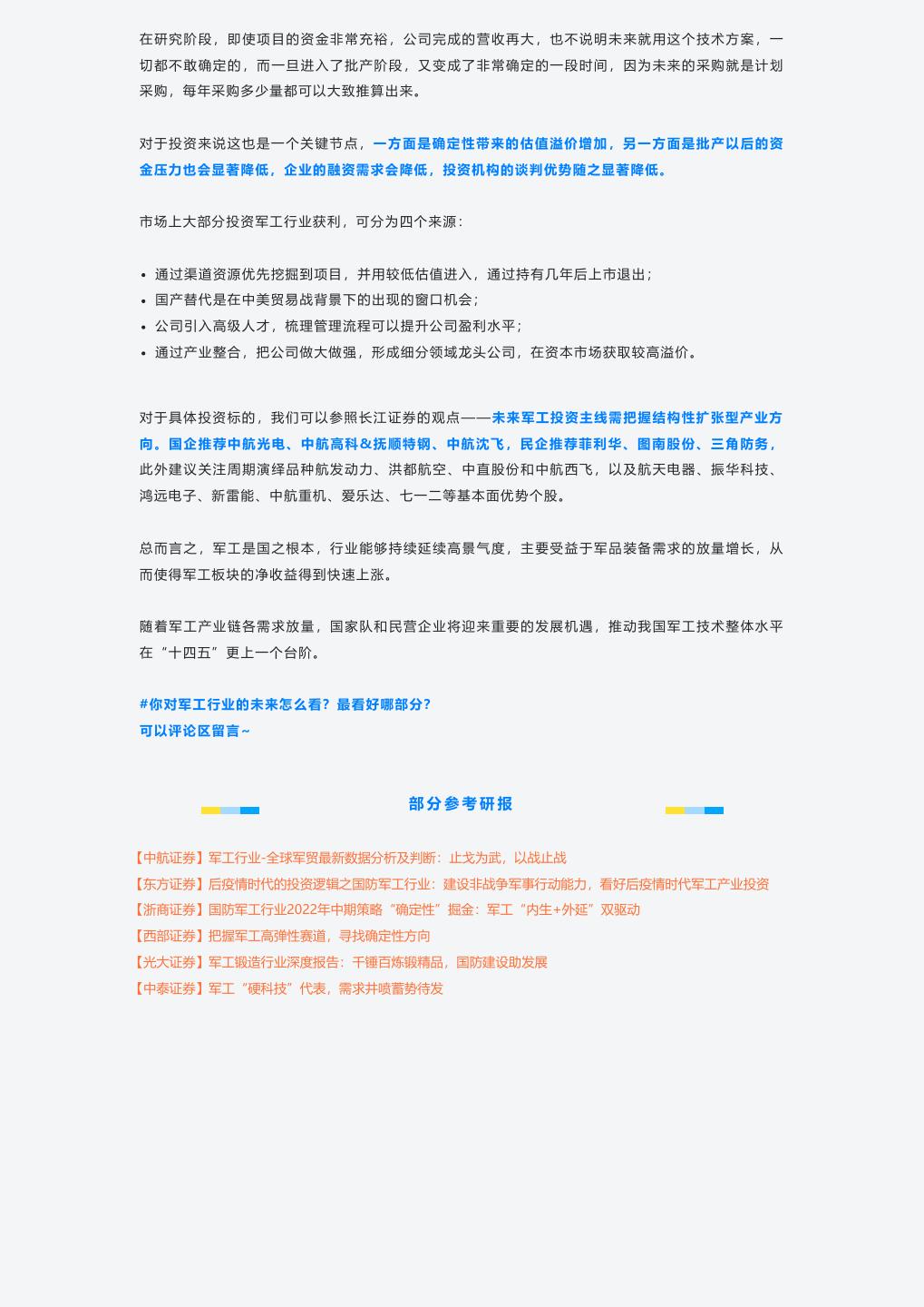 6 .在研究阶段,即使项目的资金非常充裕,公司完成的营收再大,也不说明未来就用这个技术方案,一 切都不敢确定的,而一旦进入了批产阶段,又变成了非常确定的一段时间,因为未来的采购就是计划 采购,每年采购多少量都可以大致推算出来。 对于投资来说这也是一个关键节点,一方面是确定性带来的估值溢价增加,另一方面是批产以后的资 金压力也会显著降低,企业的融资需求会降低,投资机构的谈判优势随之显著降低。 市场上大部分投资军工行业获利,可分为四个来源: 通过渠道资源优先挖掘到项目,并用较低估值进入,通过持有几年后上市退出; 国产替代是在中美贸易战背景下的出现的窗口机会; 公司引入高级人才,梳理管理流程可以提升公司盈利水平; 通过产业整合,把公司做大做强,形成细分领域龙头公司,在资本市场获取较高溢价。 对于具体投资标的,我们可以参照长江证券的观点——未来军工投资主线需把握结构性扩张型产业方 向。国企推荐中航光电、中航高科&抚顺特钢、中航沈飞,民企推荐菲利华、图南股份、三角防务, 此外建议关注周期演绎品种航发动力、洪都航空、中直股份和中航西飞,以及航天电器、振华科技、 鸿远电子、新雷能、中航重机、爱乐达、七一二等基本面优势个股。 总而言之,军工是国之根本,行业能够持续延续高景气度,主要受益于军品装备需求的放量增长,从 而使得军工板块的净收益得到快速上涨。 随着军工产业链各需求放量,国家队和民营企业将迎来重要的发展机遇,推动我国军工技术整体水平 在“十四五”更上一个台阶。 #你对军工行业的未来怎么看?最看好哪部分? 可以评论区留言~ 部分参考研报 【中航证券】军工行业-全球军贸最新数据分析及判断:止戈为武,以战止战 【东方证券】后疫情时代的投资逻辑之国防军工行业:建设非战争军事行动能力,看好后疫情时代军工产业投资 【浙商证券】国防军工行业2022年中期策略“确定性”掘金:军工“内生+外延”双驱动 【西部证券】把握军工高弹性赛道,寻找确定性方向 【光大证券】军工锻造行业深度报告:千锤百炼锻精品,国防建设助发展 【中泰证券】军工“硬科技”代表,需求井喷蓄势待发