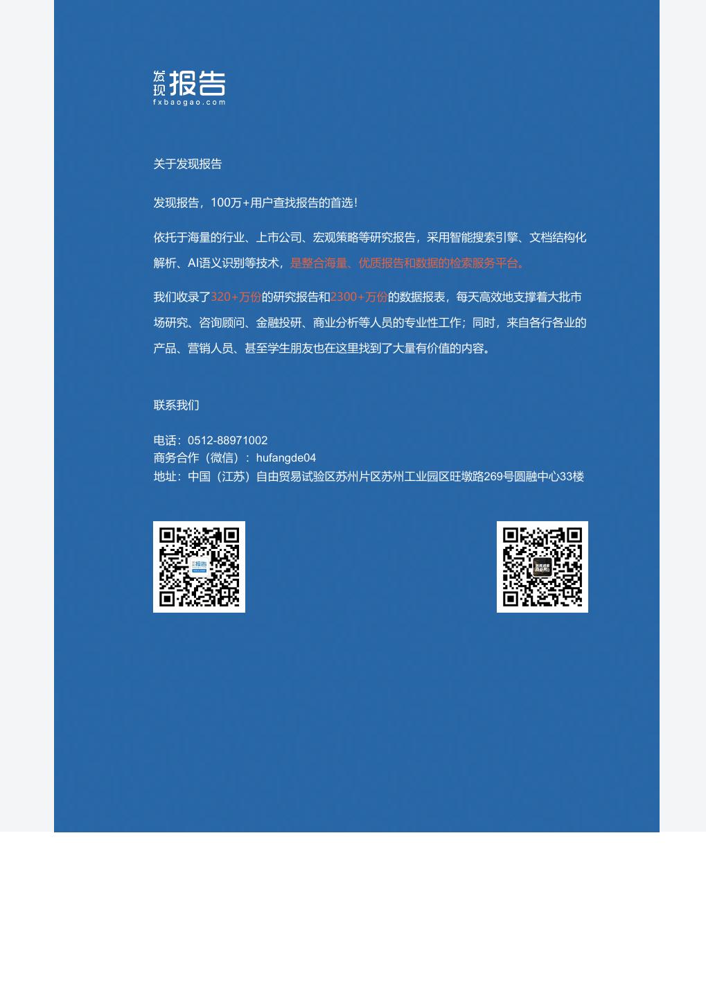 7 .关于发现报告 发现报告,100万+用户查找报告的首选! 依托于海量的行业、上市公司、宏观策略等研究报告,采用智能搜索引擎、文档结构化 解析、AI语义识别等技术,是整合海量、优质报告和数据的检索服务平台。 我们收录了320+万份的研究报告和2300+万份的数据报表,每天高效地支撑着大批市 场研究、咨询顾问、金融投研、商业分析等人员的专业性工作;同时,来自各行各业的 产品、营销人员、甚至学生朋友也在这里找到了大量有价值的内容。 联系我们 电话:0512-88971002 商务合作(微信):hufangde04 地址:中国(江苏)自由贸易试验区苏州片区苏州工业园区旺墩路269号圆融中心33楼