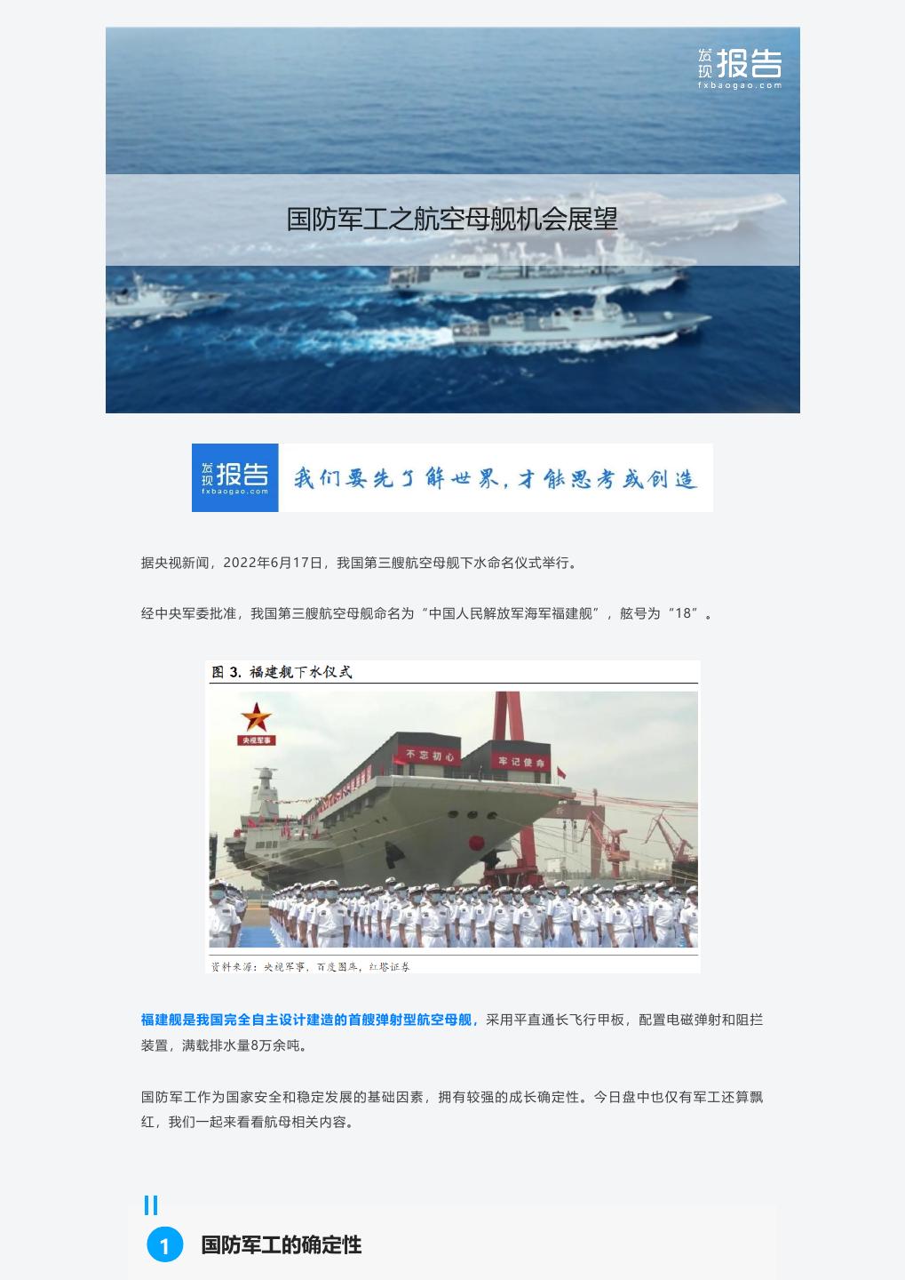 2 . 国防军工之航空母舰机会展望 据央视新闻,2022年6月17日,我国第三艘航空母舰下水命名仪式举行。 经中央军委批准,我国第三艘航空母舰命名为“中国人民解放军海军福建舰”,舷号为“18”。 福建舰是我国完全自主设计建造的首艘弹射型航空母舰,采用平直通长飞行甲板,配置电磁弹射和阻拦 装置,满载排水量8万余吨。 国防军工作为国家安全和稳定发展的基础因素,拥有较强的成长确定性。今日盘中也仅有军工还算飘 红,我们一起来看看航母相关内容。 1 国防军工的确定性