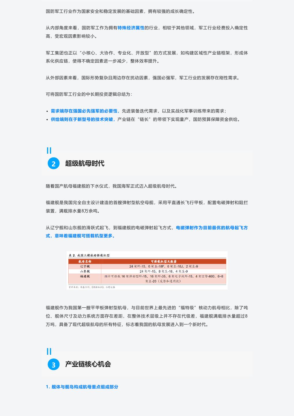 3 .国防军工行业作为国家安全和稳定发展的基础因素,拥有较强的成长确定性。 从内部角度来看,国防军工作为拥有特殊经济属性的行业,相较于其他领域,军工行业经费投入确定性 高,受宏观因素影响较小。 军工集团也正以“小核心、大协作、专业化、开放型”的方式发展,如构建区域性产业链框架,形成体 系化供应链,使得不确定因素进一步减少,整体效率提升。 从外部因素来看,国际形势复杂且周边存在扰动因素,强国必强军,军工行业的发展存在刚性需求。 可将国防军工行业的中长期投资逻辑总结为: 需求端存在强国必先强军的必要性,先进装备迭代需求,以及实战化军事训练带来的需求; 供给端则在于新型号的技术突破,产业链在“链长”的带领下实现量产,国防预算保障资金供给。 2 超级航母时代 随着国产航母福建舰的下水仪式,我国海军正式迈入超级航母时代。 福建舰是我国完全自主设计建造的首艘弹射型航空母舰,采用平直通长飞行甲板,配置电磁弹射和阻拦 装置,满载排水量8万余吨。 从辽宁舰和山东舰的滑跃式起飞,到福建舰的电磁弹射起飞方式,电磁弹射作为目前最优的航母起飞方 式,意味着福建舰可搭载机型更多。 福建舰作为我国第一艘平甲板弹射型航母,与目前世界上最先进的“福特级”核动力航母相比,除了吨 位、舰体尺寸及动力系统方面存在差距,在整体技术层级上并不存在代级差,福建舰满载排水量超过8 万吨,具备了现代超级航母的所有特征,标志着我国的航母发展进入到一个新时代。 3 产业链核心机会 1. 舰体与舰岛构成航母重点组成部分