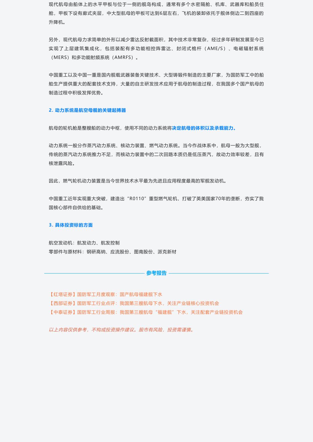 4 .现代航母由船体上的水平甲板与位于一侧的舰岛构成,通常有多个水密隔舱、机库、武器库和船员住 舱,甲板下设有廊式夹层,中大型航母的甲板可达到6层左右,飞机的装卸依托于舰体侧边二到四座的 升降机。 另外,现代航母力求简单的外形以减少雷达反射截面积,其中技术非常复杂,经过多年研制发展至今已 实 现 了 上 层 建 筑 集 成 化 , 包 括 装 配 有 多 功 能 相 控 阵 雷 达 、 封 闭 式 桅 杆 ( AME/S ) 、 电 磁 辐 射 系 统 (MERS)和多功能射频系统(AMRFS)。 中国重工以及中国一重是国内舰载武器装备关键技术、大型铸锻件制造的主要厂家,为国防军工中的船 舶生产提供重大的配套技术支持,大量的自主研发技术应用于航母的制造过程,在我国多个国产航母的 制造过程中积极发挥优势。 2. 动力系统是航空母舰的关键起搏器 航母的轮机舱是整艘船的动力中枢,使用不同的动力系统将决定航母的体积以及承载能力。 动力系统一般分作蒸汽动力系统、核动力装置、燃气动力系统。当今作战体系中,航母一般为大型舰, 传统的蒸汽动力系统推力不足,而核动力装置中的二次回路本质仍是低压蒸汽,故动力效率较差,且有 核泄露风险。 因此,燃气轮机动力装置是当今世界技术水平最为先进且应用程度最高的军舰发动机。 中国重工近年实现重大突破,建造出“R0110”重型燃气轮机,打破了英美国家70年的垄断,夯实了我 国核心部件自供给的基础。 3. 具体投资标的方面 航空发动机:航发动力、航发控制 零部件与原材料:钢研高纳、应流股份、图南股份、派克新材 参考报告 【红塔证券】国防军工月度观察:国产航母福建舰下水 【西部证券】国防军工行业点评:我国第三艘航母下水,关注产业链核心投资机会 【中泰证券】国防军工行业周报:我国第三艘航母“福建舰”下水,关注配套产业链投资机会 以上内容仅供参考,不构成投资操作建议。股市有风险,投资需谨慎。