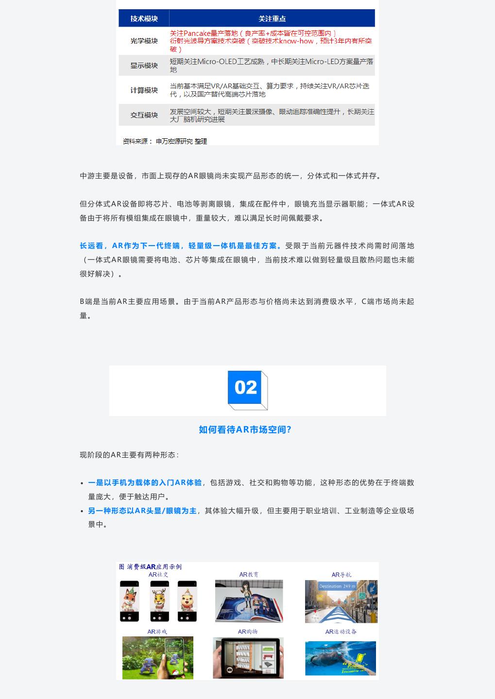 5 .中游主要是设备,市面上现存的AR眼镜尚未实现产品形态的统一,分体式和一体式并存。 但分体式AR设备即将芯片、电池等剥离眼镜,集成在配件中,眼镜充当显示器职能;一体式AR设 备由于将所有模组集成在眼镜中,重量较大,难以满足长时间佩戴要求。 长 远 看 , AR 作 为 下 一 代 终 端 , 轻 量 级 一 体 机 是 最 佳 方 案 。 受 限 于 当 前 元 器 件 技 术 尚 需 时 间 落 地 (一体式AR眼镜需要将电池、芯片等集成在眼镜中,当前技术难以做到轻量级且散热问题也未能 很好解决)。 B端是当前AR主要应用场景。由于当前AR产品形态与价格尚未达到消费级水平,C端市场尚未起 量。 如何看待AR市场空间? 现阶段的AR主要有两种形态: 一是以手机为载体的入门AR体验,包括游戏、社交和购物等功能,这种形态的优势在于终端数 量庞大,便于触达用户。 另一种形态以AR头显/眼镜为主,其体验大幅升级,但主要用于职业培训、工业制造等企业级场 景中。