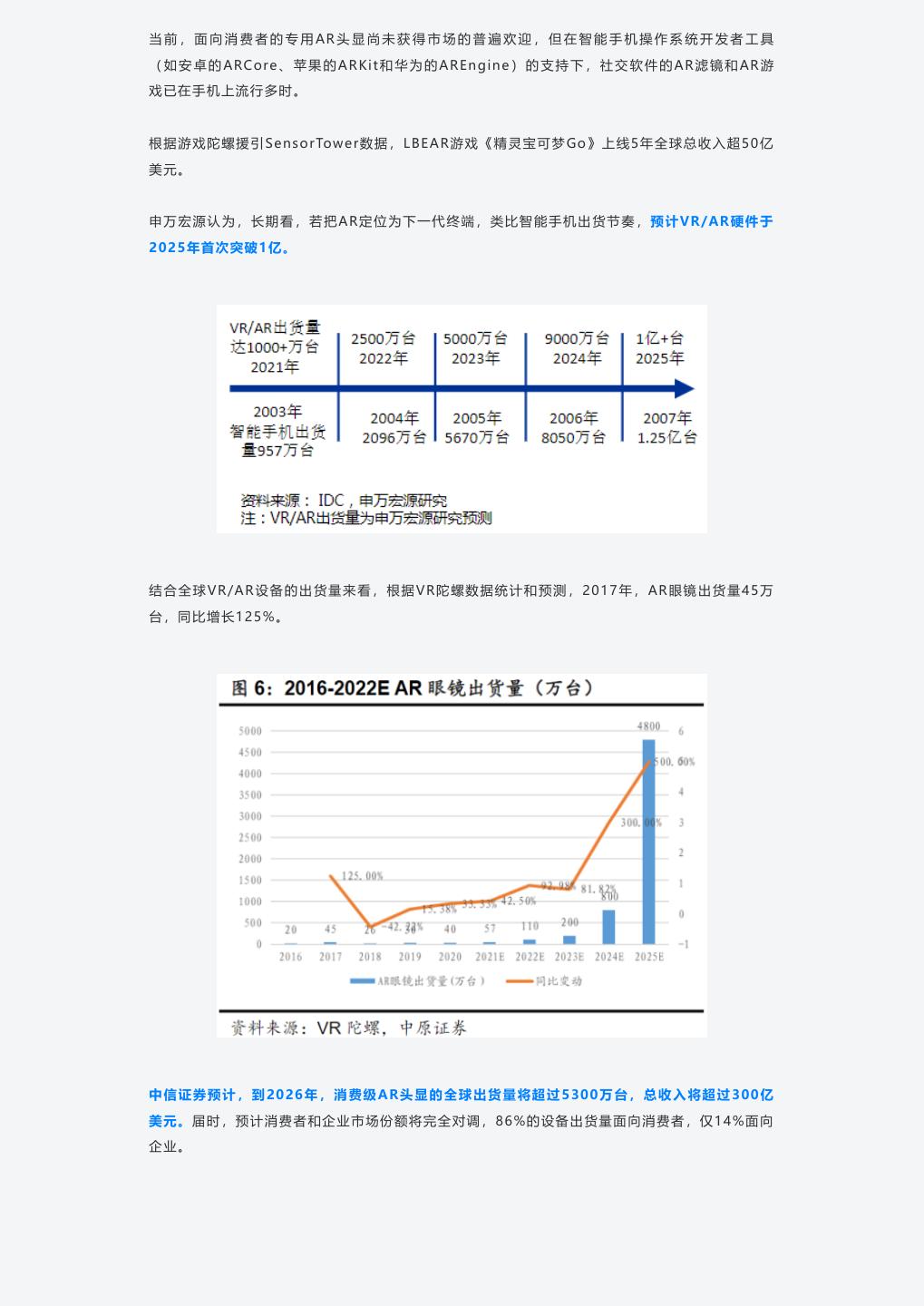 6 .当 前 , 面 向 消 费 者 的 专 用 AR 头 显 尚 未 获 得 市 场 的 普 遍 欢 迎 , 但 在 智 能 手 机 操 作 系 统 开 发 者 工 具 ( 如 安 卓 的 A RC o re 、 苹 果 的 A R K i t 和 华 为 的 A R E n g i n e ) 的 支 持 下 , 社 交 软 件 的 A R 滤 镜 和 A R 游 戏已在手机上流行多时。 根 据 游 戏 陀 螺 援 引 S e n s o r To w e r 数 据 , L B E A R 游 戏 《 精 灵 宝 可 梦 G o 》 上 线 5 年 全 球 总 收 入 超 5 0 亿 美元。 申万宏源认为,长期看,若把AR定位为下一代终端,类比智能手机出货节奏,预计VR/AR硬件于 2025年首次突破1亿。 结合全球VR/AR设备的出货量来看,根据VR陀螺数据统计和预测,2017年,AR眼镜出货量45万 台,同比增长125%。 中信证券预计,到2026年,消费级AR头显的全球出货量将超过5300万台,总收入将超过300亿 美元。届时,预计消费者和企业市场份额将完全对调,86%的设备出货量面向消费者,仅14%面向 企业。
