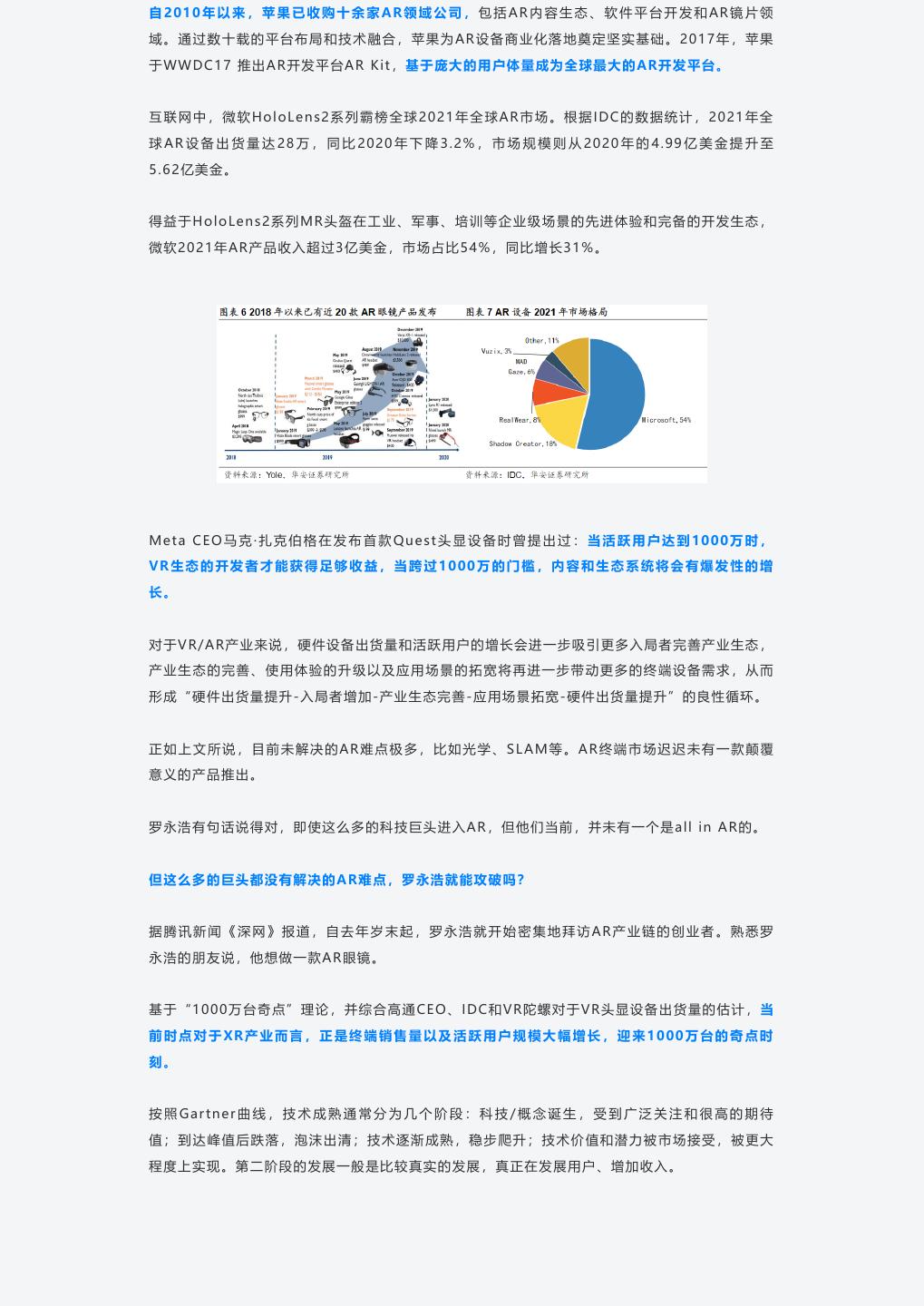 8 .自 2010 年 以 来 , 苹 果 已 收 购 十 余 家 AR 领 域 公 司 , 包 括 AR 内 容 生 态 、 软 件 平 台 开 发 和 AR 镜 片 领 域。通过数十载的平台布局和技术融合,苹果为AR设备商业化落地奠定坚实基础。2017年,苹果 于WWDC17 推出AR开发平台AR Kit,基于庞大的用户体量成为全球最大的AR开发平台。 互联网中,微软HoloLens2系列霸榜全球2021年全球AR市场。根据IDC的数据统计,2021年全 球 AR 设 备 出 货 量 达 28 万 , 同 比 2020 年 下 降 3.2% , 市 场 规 模 则 从 2020 年 的 4.99 亿 美 金 提 升 至 5.62亿美金。 得益于HoloLens2系列MR头盔在工业、军事、培训等企业级场景的先进体验和完备的开发生态, 微软2021年AR产品收入超过3亿美金,市场占比54%,同比增长31%。 Meta CEO 马 克 · 扎 克 伯 格 在 发 布 首 款 Quest 头 显 设 备 时 曾 提 出 过 : 当 活 跃 用 户 达 到 1000 万 时 , VR 生 态 的 开 发 者 才 能 获 得 足 够 收 益 , 当 跨 过 1000 万 的 门 槛 , 内 容 和 生 态 系 统 将 会 有 爆 发 性 的 增 长。 对于VR/AR产业来说,硬件设备出货量和活跃用户的增长会进一步吸引更多入局者完善产业生态, 产业生态的完善、使用体验的升级以及应用场景的拓宽将再进一步带动更多的终端设备需求,从而 形成“硬件出货量提升-入局者增加-产业生态完善-应用场景拓宽-硬件出货量提升”的良性循环。 正如上文所说,目前未解决的AR难点极多,比如光学、SLAM等。AR终端市场迟迟未有一款颠覆 意义的产品推出。 罗永浩有句话说得对,即使这么多的科技巨头进入AR,但他们当前,并未有一个是all in AR的。 但这么多的巨头都没有解决的AR难点,罗永浩就能攻破吗? 据腾讯新闻《深网》报道,自去年岁末起,罗永浩就开始密集地拜访AR产业链的创业者。熟悉罗 永浩的朋友说,他想做一款AR眼镜。 基于“1000万台奇点”理论,并综合高通CEO、IDC和VR陀螺对于VR头显设备出货量的估计,当 前 时 点 对 于 XR 产 业 而 言 , 正 是 终 端 销 售 量 以 及 活 跃 用 户 规 模 大 幅 增 长 , 迎 来 1000 万 台 的 奇 点 时 刻。 按 照 Gartner 曲 线 , 技 术 成 熟 通 常 分 为 几 个 阶 段 : 科 技 / 概 念 诞 生 , 受 到 广 泛 关 注 和 很 高 的 期 待 值;到达峰值后跌落,泡沫出清;技术逐渐成熟,稳步爬升;技术价值和潜力被市场接受,被更大 程度上实现。第二阶段的发展一般是比较真实的发展,真正在发展用户、增加收入。