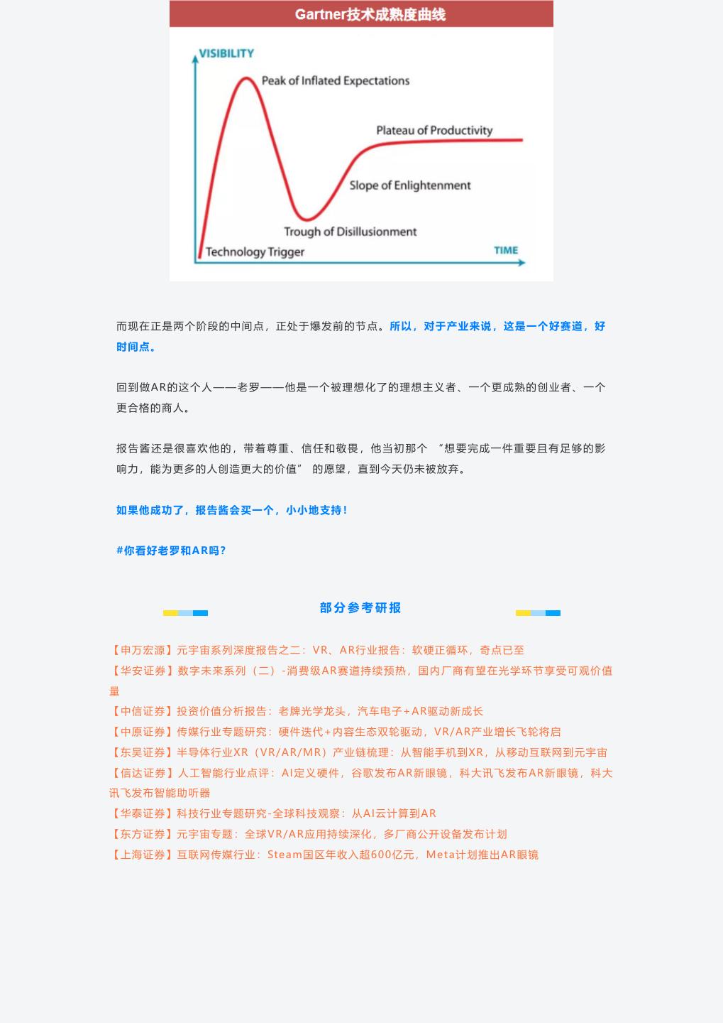 9 . 而现在正是两个阶段的中间点,正处于爆发前的节点。所以,对于产业来说,这是一个好赛道,好 时间点。 回到做AR的这个人——老罗——他是一个被理想化了的理想主义者、一个更成熟的创业者、一个 更合格的商人。 报告酱还是很喜欢他的,带着尊重、信任和敬畏,他当初那个 “想要完成一件重要且有足够的影 响力,能为更多的人创造更大的价值” 的愿望,直到今天仍未被放弃。 如果他成功了,报告酱会买一个,小小地支持! #你看好老罗和AR吗? 部分参考研报 【申万宏源】元宇宙系列深度报告之二:VR、AR行业报告:软硬正循环,奇点已至 【华安证券】数字未来系列(二)-消费级AR赛道持续预热,国内厂商有望在光学环节享受可观价值 量 【中信证券】投资价值分析报告:老牌光学龙头,汽车电子+AR驱动新成长 【中原证券】传媒行业专题研究:硬件迭代+内容生态双轮驱动,VR/AR产业增长飞轮将启 【东吴证券】半导体行业XR(VR/AR/MR)产业链梳理:从智能手机到XR,从移动互联网到元宇宙 【信达证券】人工智能行业点评:AI定义硬件,谷歌发布AR新眼镜,科大讯飞发布AR新眼镜,科大 讯飞发布智能助听器 【华泰证券】科技行业专题研究-全球科技观察:从AI云计算到AR 【东方证券】元宇宙专题:全球VR/AR应用持续深化,多厂商公开设备发布计划 【 上 海 证 券 】 互 联 网 传 媒 行 业 : Ste a m 国 区 年 收 入 超 6 0 0 亿 元 , M e t a 计 划 推 出 A R 眼 镜
