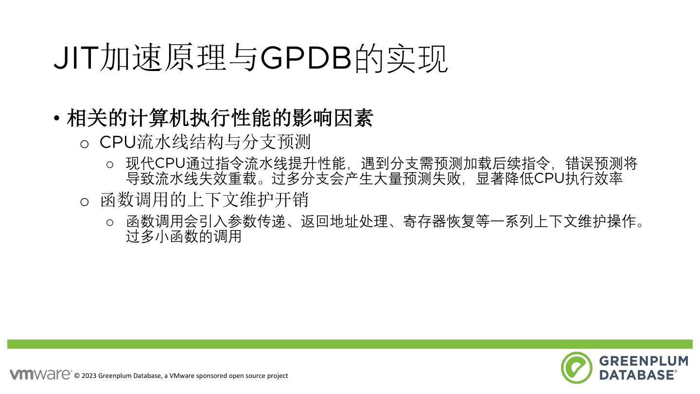 4 .JIT加速原理与GPDB的实现 • 相关的计算机执行性能的影响因素 o CPU流水线结构与分支预测 o 现代CPU通过指令流⽔线提升性能,遇到分⽀需预测加载后续指令,错误预测将 导致流⽔线失效重载。过多分⽀会产⽣⼤量预测失败,显著降低CPU执⾏效率 o 函数调用的上下文维护开销 o 函数调⽤会引⼊参数传递、返回地址处理、寄存器恢复等⼀系列上下⽂维护操作。 过多⼩函数的调⽤ © 2023 Greenplum Database, a VMware sponsored open source project