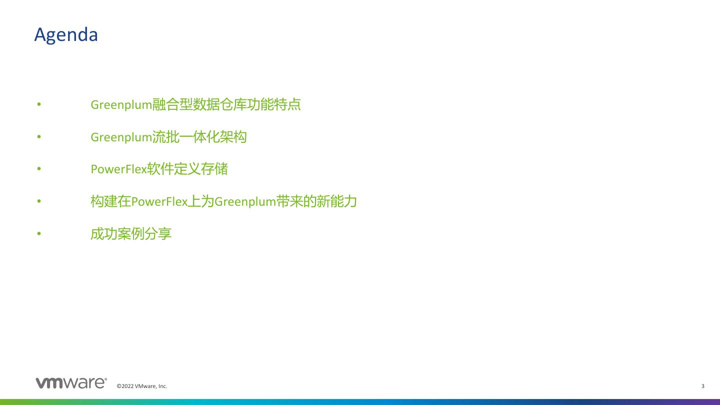 3 .Agenda • Greenplum融合型数据仓库功能特点 • Greenplum流批一体化架构 • PowerFlex软件定义存储 • 构建在PowerFlex上为Greenplum带来的新能力 • 成功案例分享 © 2022 VMware, Inc. 3