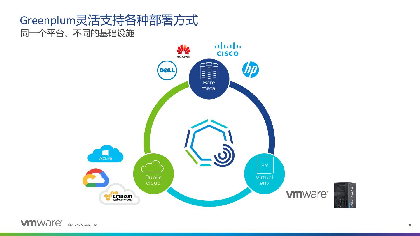 7 .VMware Greenplum Data Science Greenplum的企业数据分析平台典型架构-流批一体 Structured, Semi, Un-Structured Data ETL, Streaming ● Scale Out SQL, R, Python, Java,C... JSON , XML , Graph Data Scientists IoT Data Business Users Voice, Video, Image Data Analysts Geo Spatial , Time Series IT Professionals Data Sources And many more… BI/Analytic/ML ... End-Users Hadoop Data Lakes / Other Data Platforms / Public Cloud Data Data Ingestion Lakes / External Storages Data Visualization All Data Types © 2022 VMware, Inc. 7