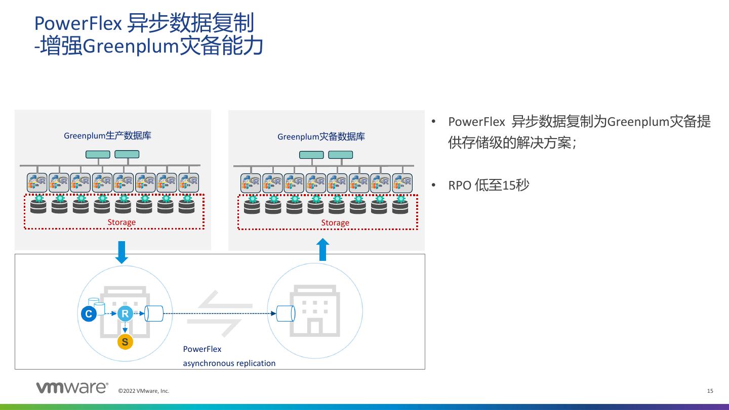 14 . PowerFlex 一致性卷组快照 -增强Greenplum数据保护能力 • PowerFlex 一致性卷组Snapshot快照,可为Greenplum分布 式存储提供全局一致性时点数据快照; Greenplum分布式数据库 • 数据库快照为系统升级、数据维护时的快速回退提高安全 保障 Storage • PowerFlex的Schedule定期快照为系统快速备份、数据误 ● 快照恢复 删除等提供存储级的解决方案 ● 快照 • 快照未来还可用于从生产环境构建测试测试等场景 PowerFlex Snapshot © 2022 VMware, Inc. 14