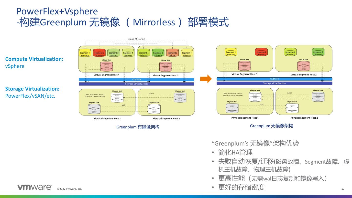 17 . PowerFlex+Vsphere -构建Greenplum 无镜像( Mirrorless )部署模式 Compute Virtualization: vSphere Storage Virtualization: PowerFlex/vSAN/etc. Greenplum 有镜像架构 Greenplum 无镜像架构 “Greenplum’s 无镜像”架构优势 • 简化HA管理 • 失败自动恢复/迁移(磁盘故障、Segment故障、虚 机主机故障、物理主机故障) • 更高性能(无需wal日志复制和镜像写入) © 2022 VMware, Inc. • 更好的存储密度 17